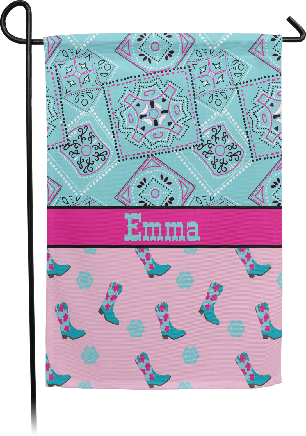 This design has a wild west theme and features a turquoise and pink bandana print on the top half, a pink stripe across the middle, and cowgirl boots and flowers on the bottom. The coordinating design is hot pink, has a turquoise stripe and scalloped circle in the middle, and horseshoes in the background print.