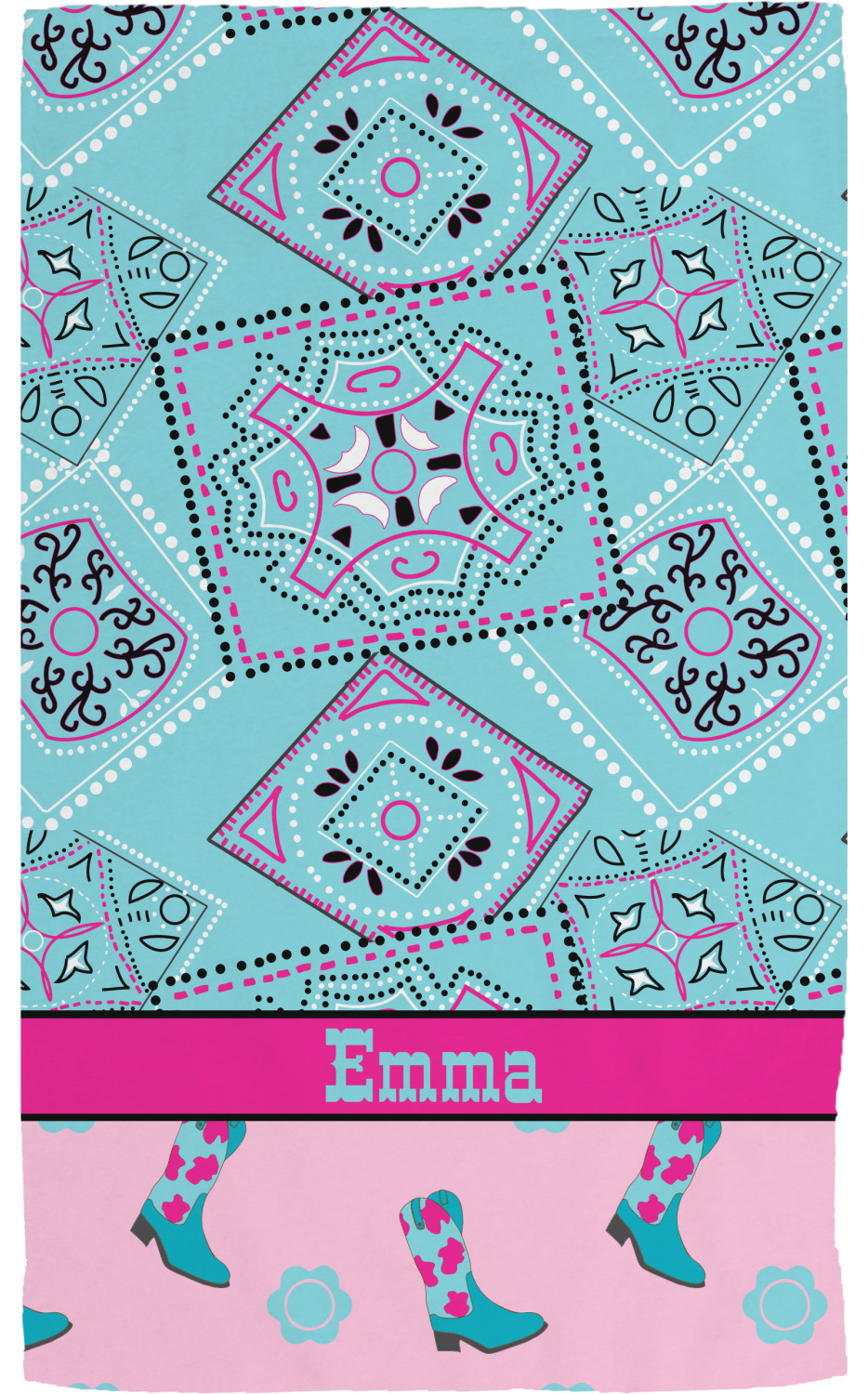 This design has a wild west theme and features a turquoise and pink bandana print on the top half, a pink stripe across the middle, and cowgirl boots and flowers on the bottom. The coordinating design is hot pink, has a turquoise stripe and scalloped circle in the middle, and horseshoes in the background print.