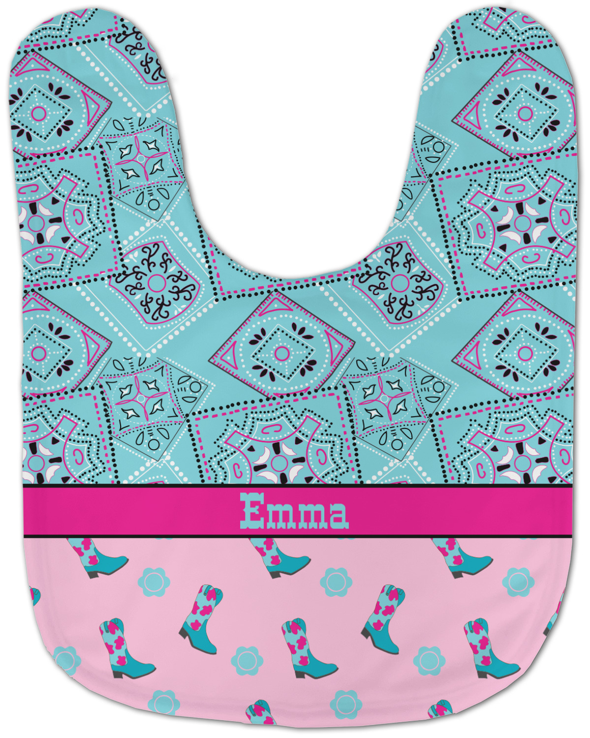 This design has a wild west theme and features a turquoise and pink bandana print on the top half, a pink stripe across the middle, and cowgirl boots and flowers on the bottom. The coordinating design is hot pink, has a turquoise stripe and scalloped circle in the middle, and horseshoes in the background print.