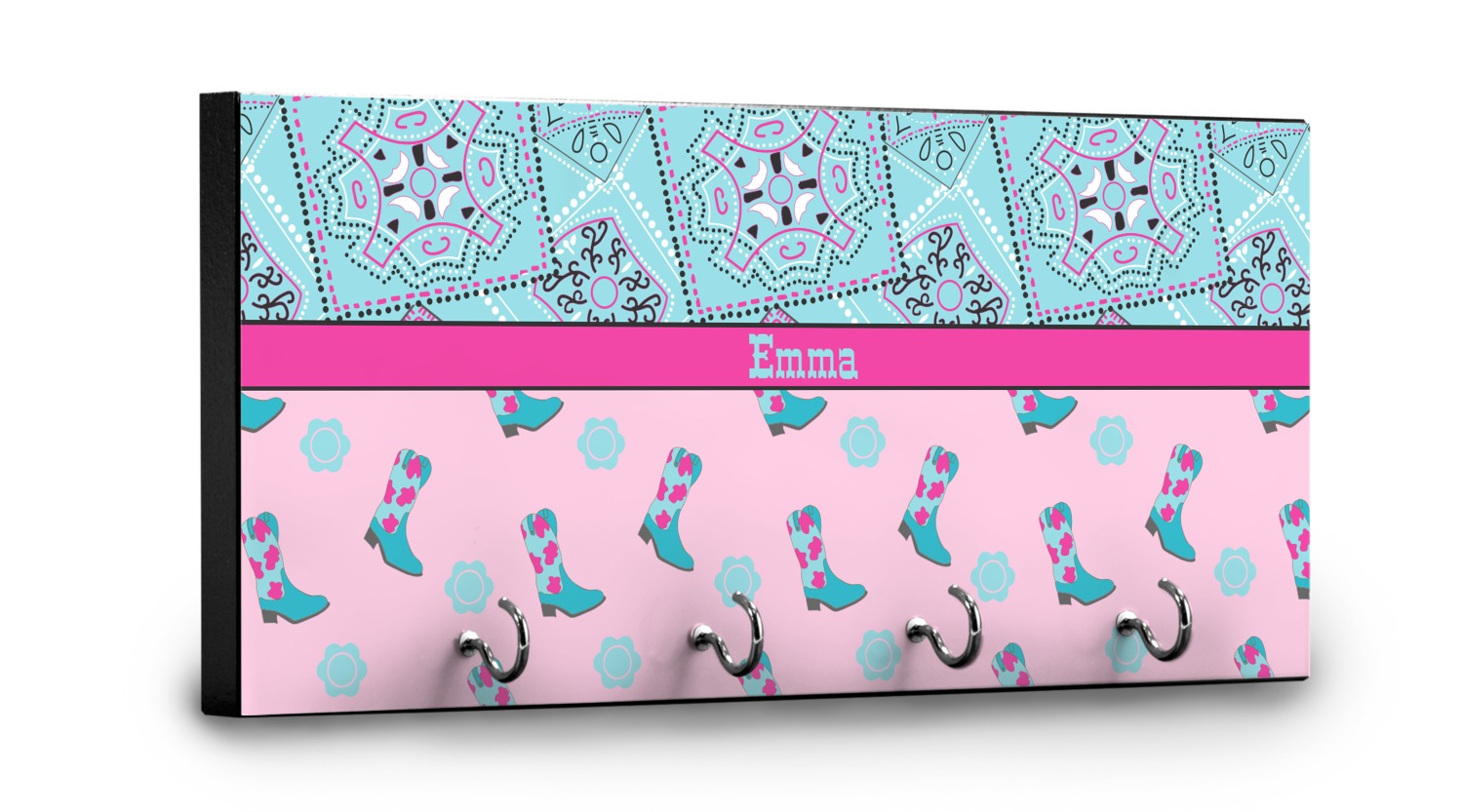 This design has a wild west theme and features a turquoise and pink bandana print on the top half, a pink stripe across the middle, and cowgirl boots and flowers on the bottom. The coordinating design is hot pink, has a turquoise stripe and scalloped circle in the middle, and horseshoes in the background print.