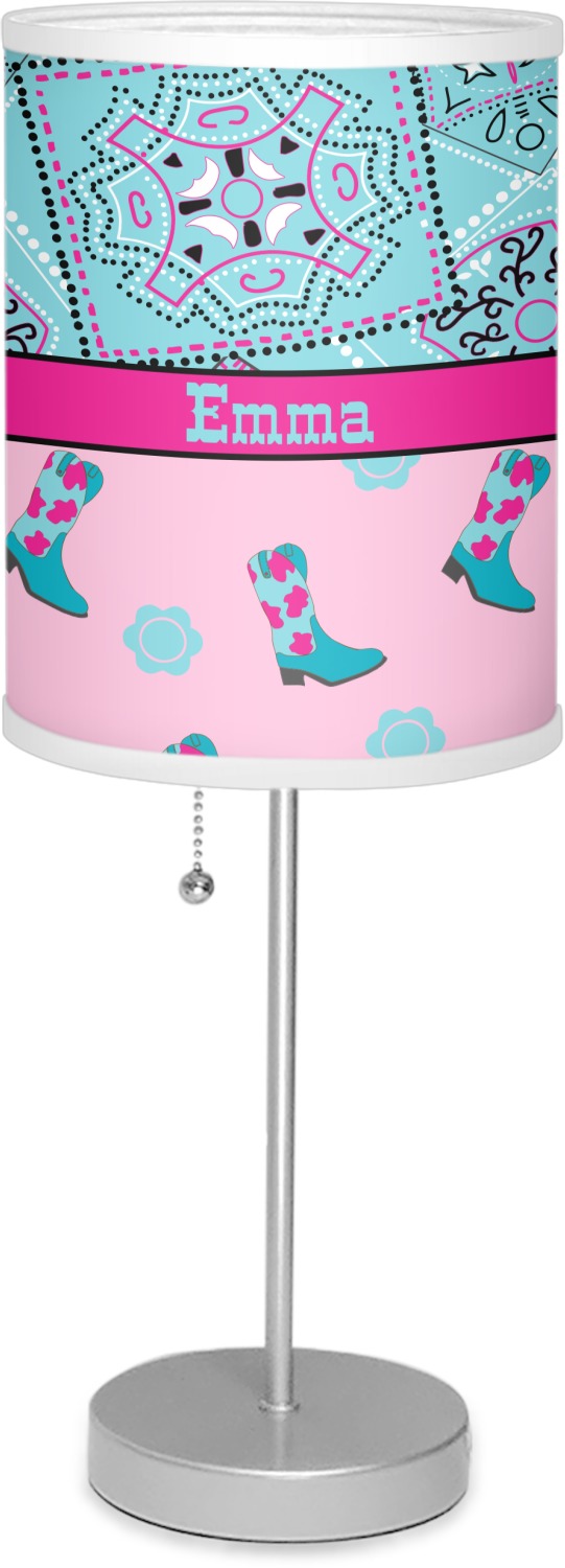 This design has a wild west theme and features a turquoise and pink bandana print on the top half, a pink stripe across the middle, and cowgirl boots and flowers on the bottom. The coordinating design is hot pink, has a turquoise stripe and scalloped circle in the middle, and horseshoes in the background print.