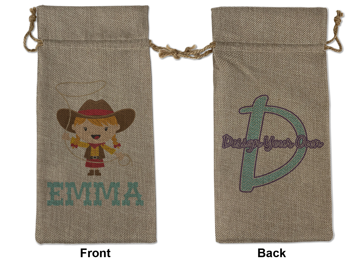 We sell our Burlap Gift Bags in 3 variant sized bags. Made with burlap polyester, each personalized bag can be secured with a twine drawstring pull. Your custom design is available to print on one side or both sides - completely up to you! The sizes of the bags measure approximately 4.5" x 6.5" for the smallest size, 6.5" x 8.0" for the medium size, and 6.5" x 13.5" for the large-sized bag.