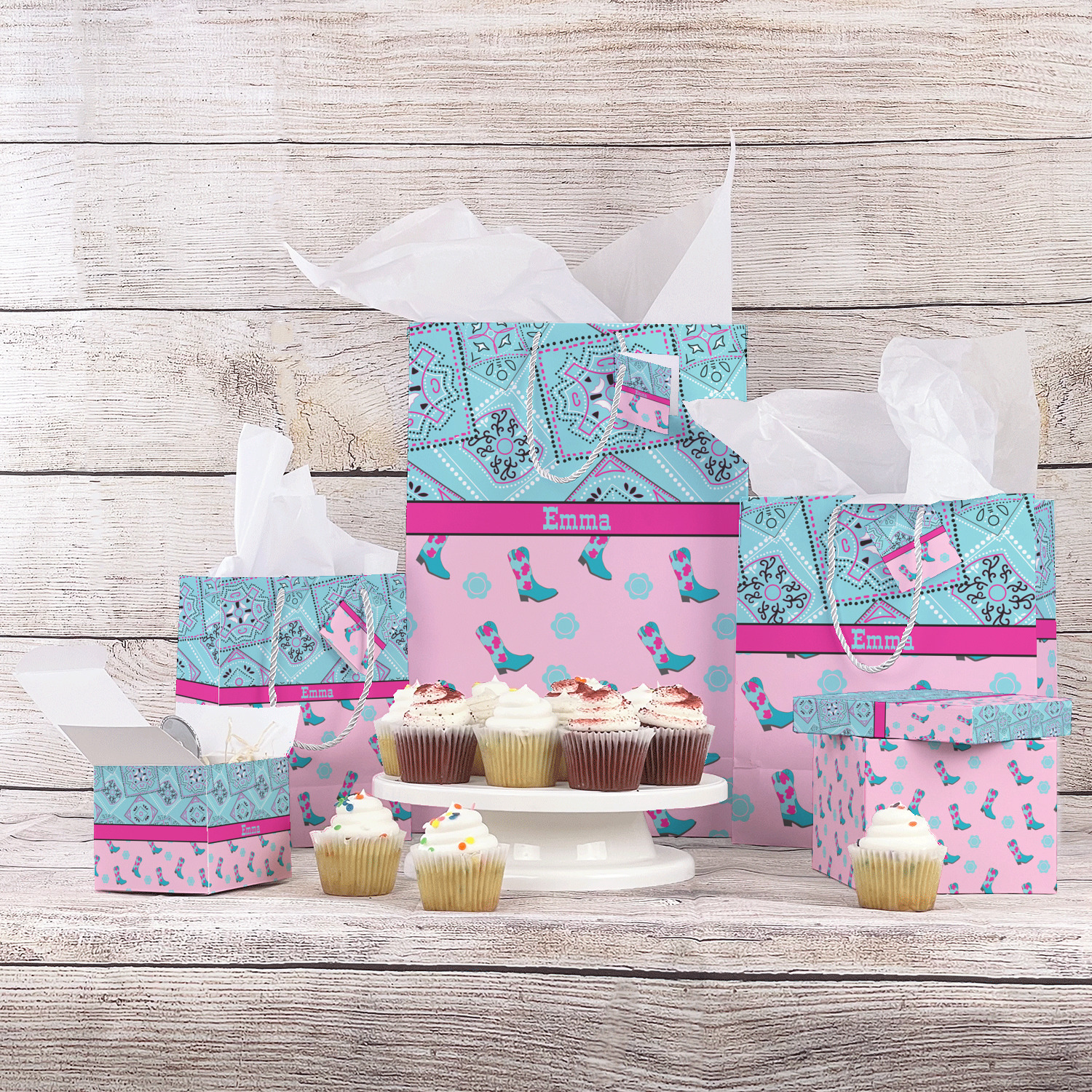 This design has a wild west theme and features a turquoise and pink bandana print on the top half, a pink stripe across the middle, and cowgirl boots and flowers on the bottom. The coordinating design is hot pink, has a turquoise stripe and scalloped circle in the middle, and horseshoes in the background print.