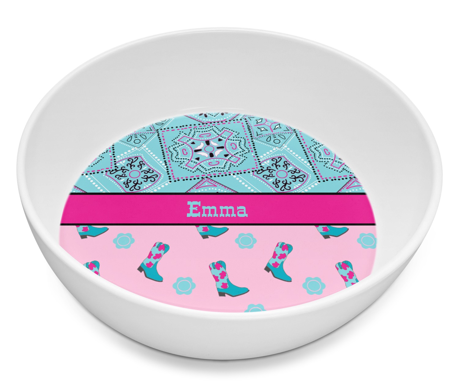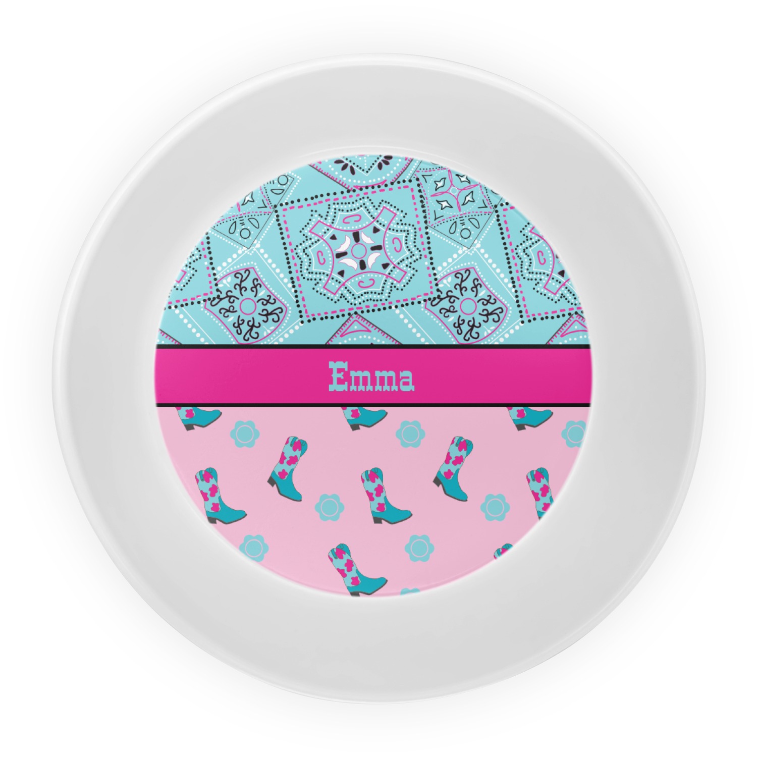 This design has a wild west theme and features a turquoise and pink bandana print on the top half, a pink stripe across the middle, and cowgirl boots and flowers on the bottom. The coordinating design is hot pink, has a turquoise stripe and scalloped circle in the middle, and horseshoes in the background print.