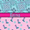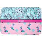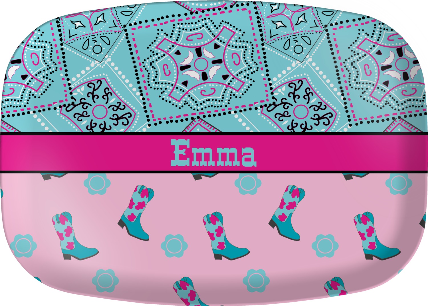 This design has a wild west theme and features a turquoise and pink bandana print on the top half, a pink stripe across the middle, and cowgirl boots and flowers on the bottom. The coordinating design is hot pink, has a turquoise stripe and scalloped circle in the middle, and horseshoes in the background print.