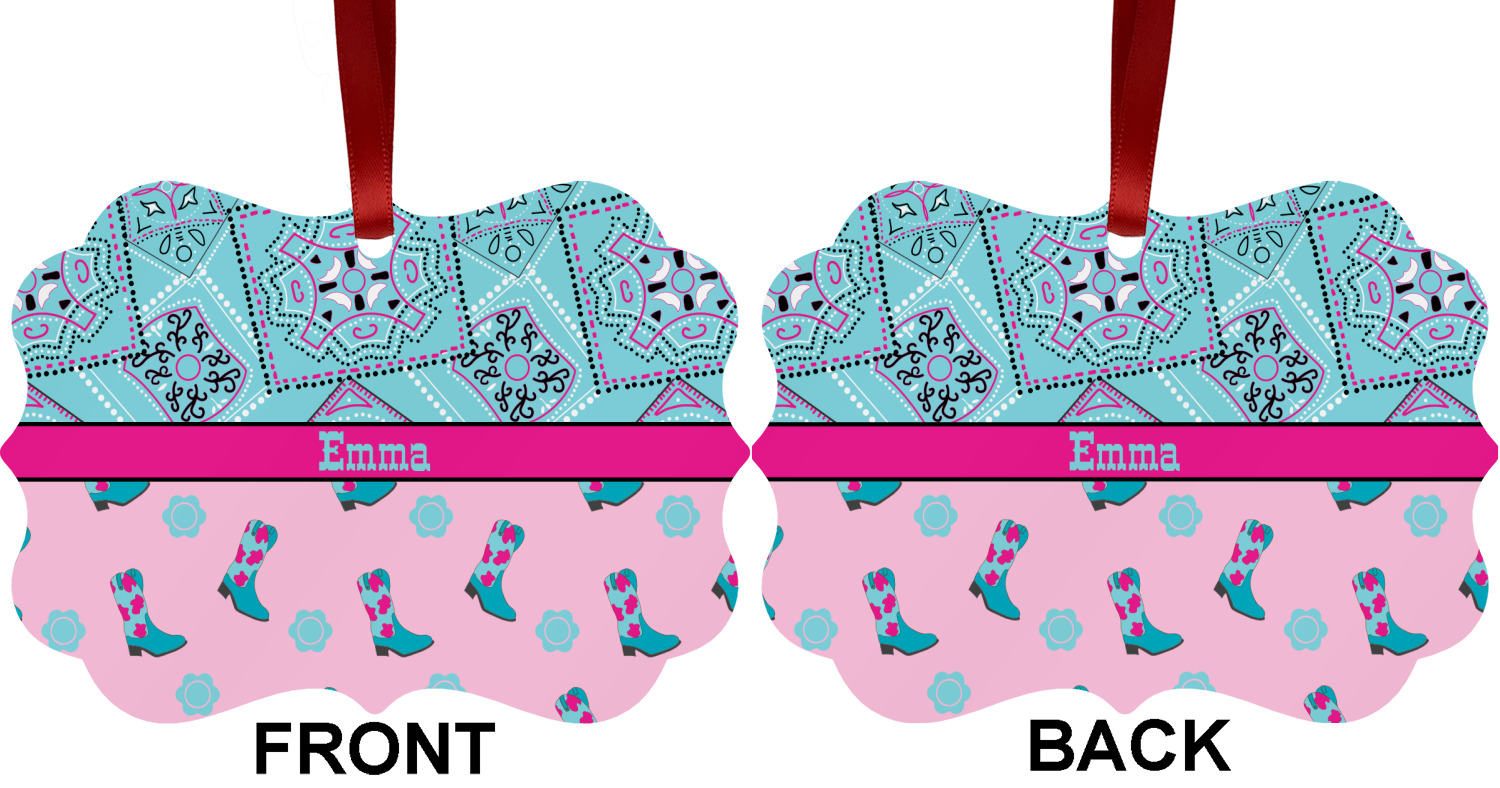 This design has a wild west theme and features a turquoise and pink bandana print on the top half, a pink stripe across the middle, and cowgirl boots and flowers on the bottom. The coordinating design is hot pink, has a turquoise stripe and scalloped circle in the middle, and horseshoes in the background print.