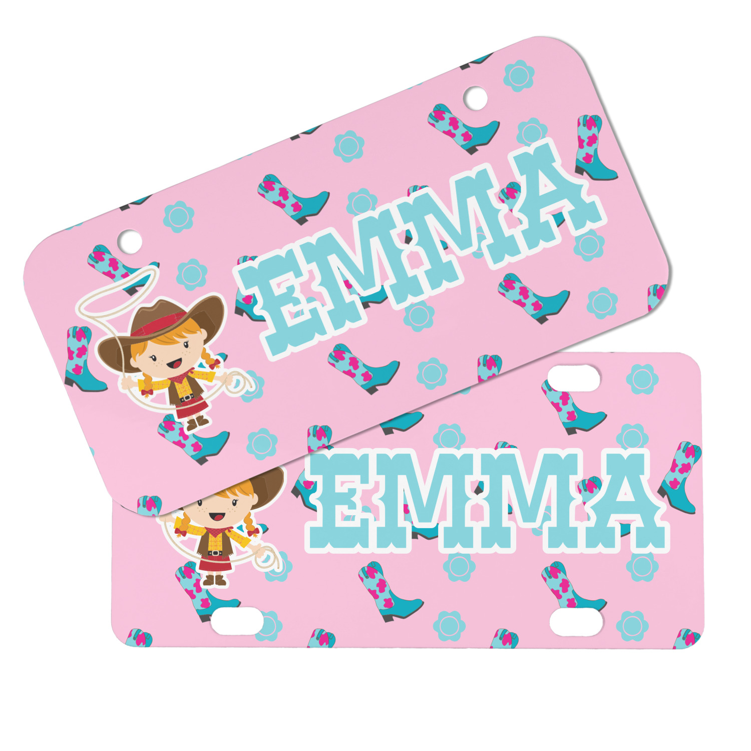 This design has a wild west theme and features a turquoise and pink bandana print on the top half, a pink stripe across the middle, and cowgirl boots and flowers on the bottom. The coordinating design is hot pink, has a turquoise stripe and scalloped circle in the middle, and horseshoes in the background print.