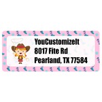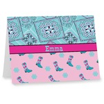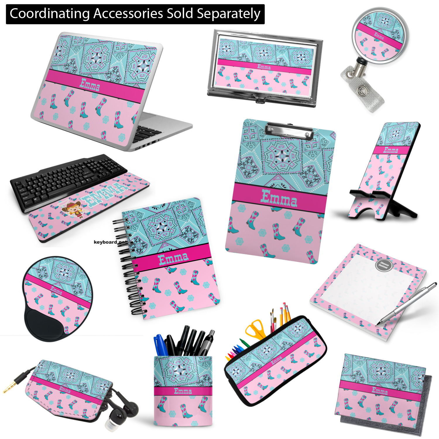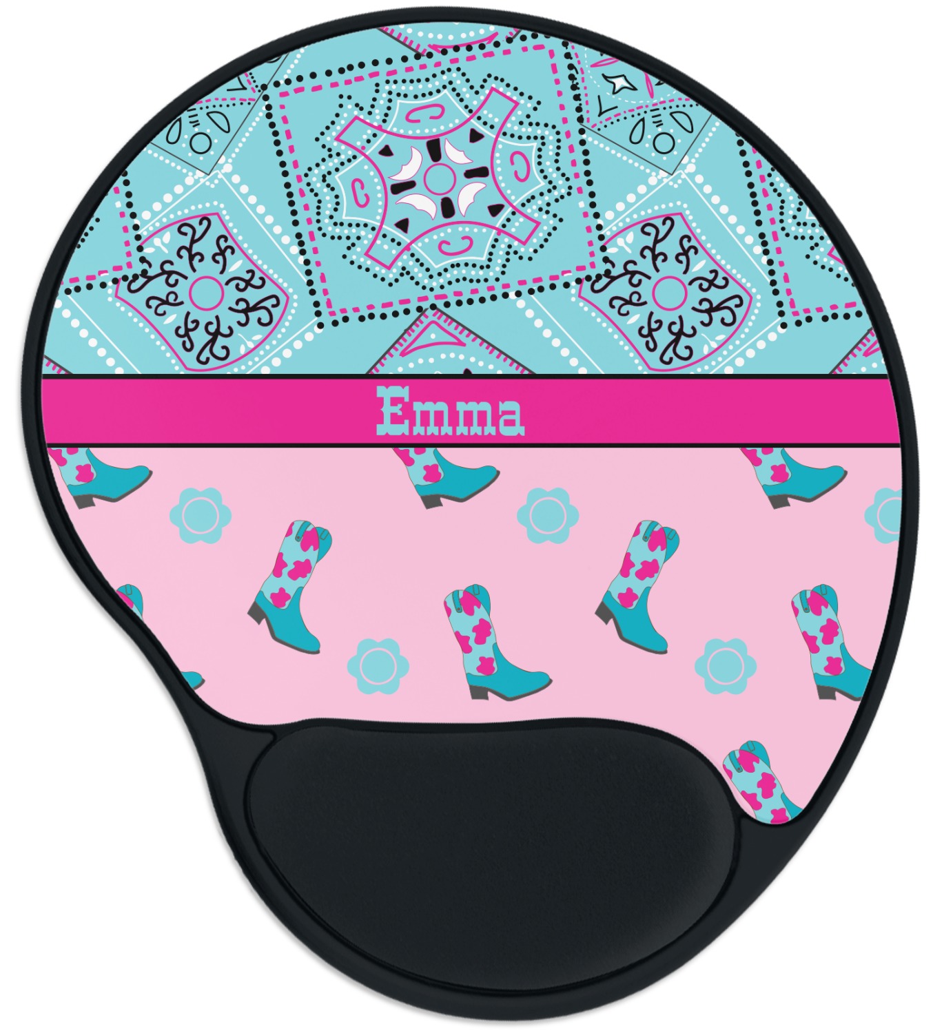 This design has a wild west theme and features a turquoise and pink bandana print on the top half, a pink stripe across the middle, and cowgirl boots and flowers on the bottom. The coordinating design is hot pink, has a turquoise stripe and scalloped circle in the middle, and horseshoes in the background print.