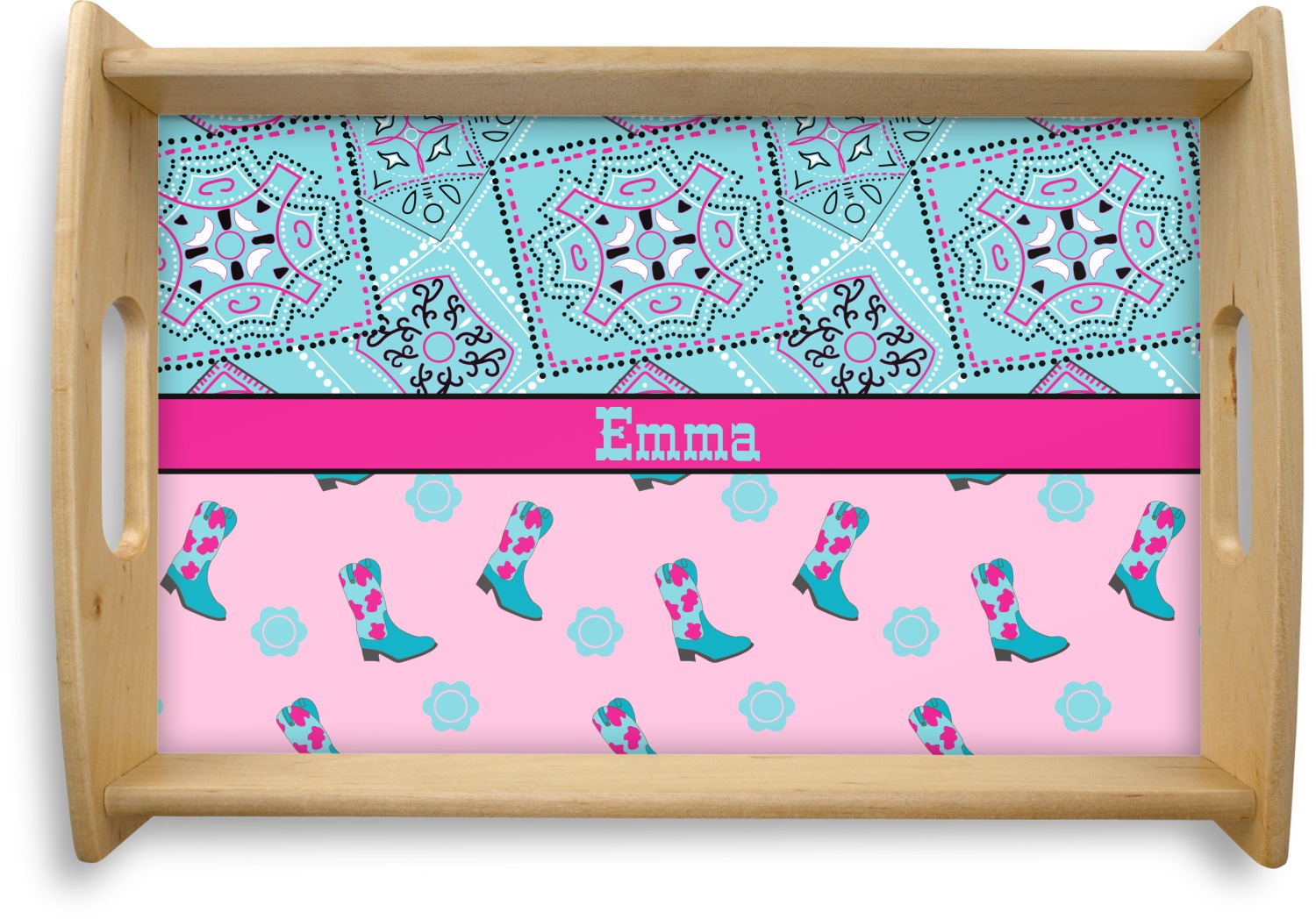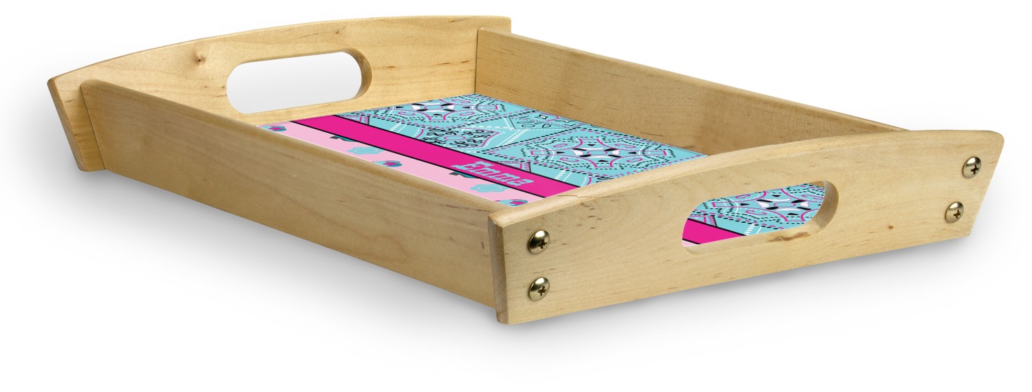 This serving tray with handles features square edges and two rounded sides, creating a very modern look. Each side is fabricated from a beautifully cut, natural wood. The bottom of the interior of the tray displays your customized design in bright, vibrant color. The tray is sold in both a black color and a natural wood look. Each variation of the wood serving tray has two sizes: Small, which is 14" x 10" x 2.25", and Large, which is 19.5" x 13.5" x 2.75".