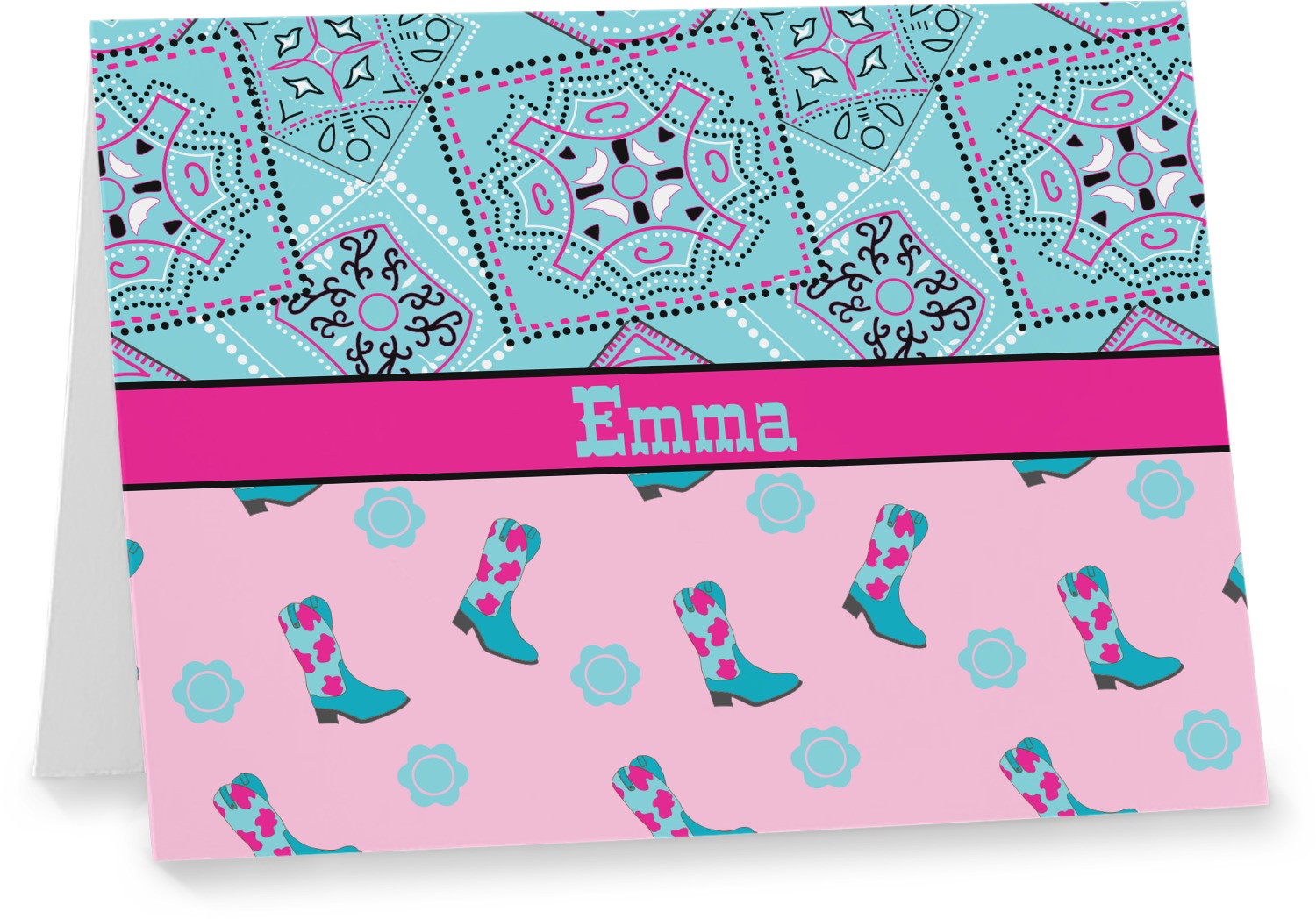 This design has a wild west theme and features a turquoise and pink bandana print on the top half, a pink stripe across the middle, and cowgirl boots and flowers on the bottom. The coordinating design is hot pink, has a turquoise stripe and scalloped circle in the middle, and horseshoes in the background print.