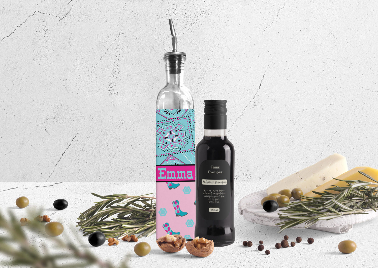 Made from recycled glass in Spain, these oil bottles have a classic, delicate look, and are accompanied by a metal spout for controlled pouring. Each bottle holds approximately 13 ounces and measures at 12 by 2 inches. We customize your glass oil bottle by applying your personalized design on the front and sides, using an adhesive. Our customizable stickers are made from high quality, gloss vinyl and are printed with waterproof, eco-solvent inks. These pieces are machine cut for accuracy and symmetry. The result is a robust, waterproof, adhesive decal that will not fade or deteriorate with time.