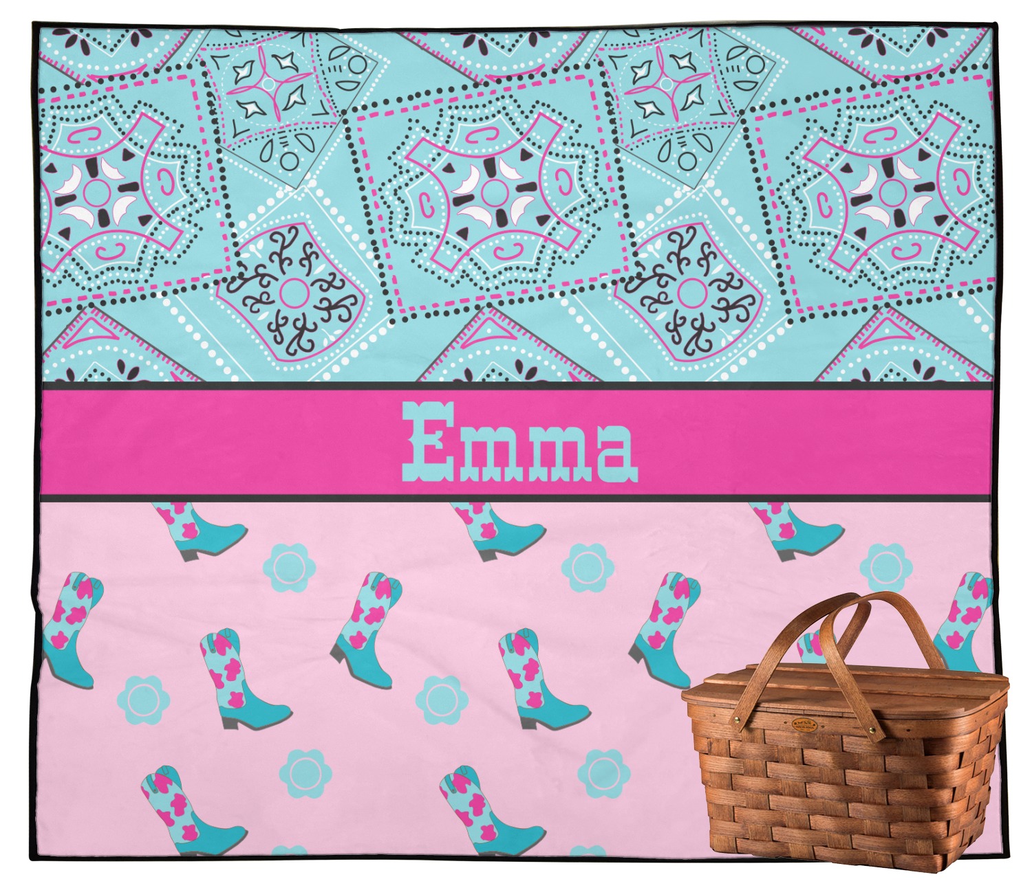 This design has a wild west theme and features a turquoise and pink bandana print on the top half, a pink stripe across the middle, and cowgirl boots and flowers on the bottom. The coordinating design is hot pink, has a turquoise stripe and scalloped circle in the middle, and horseshoes in the background print.