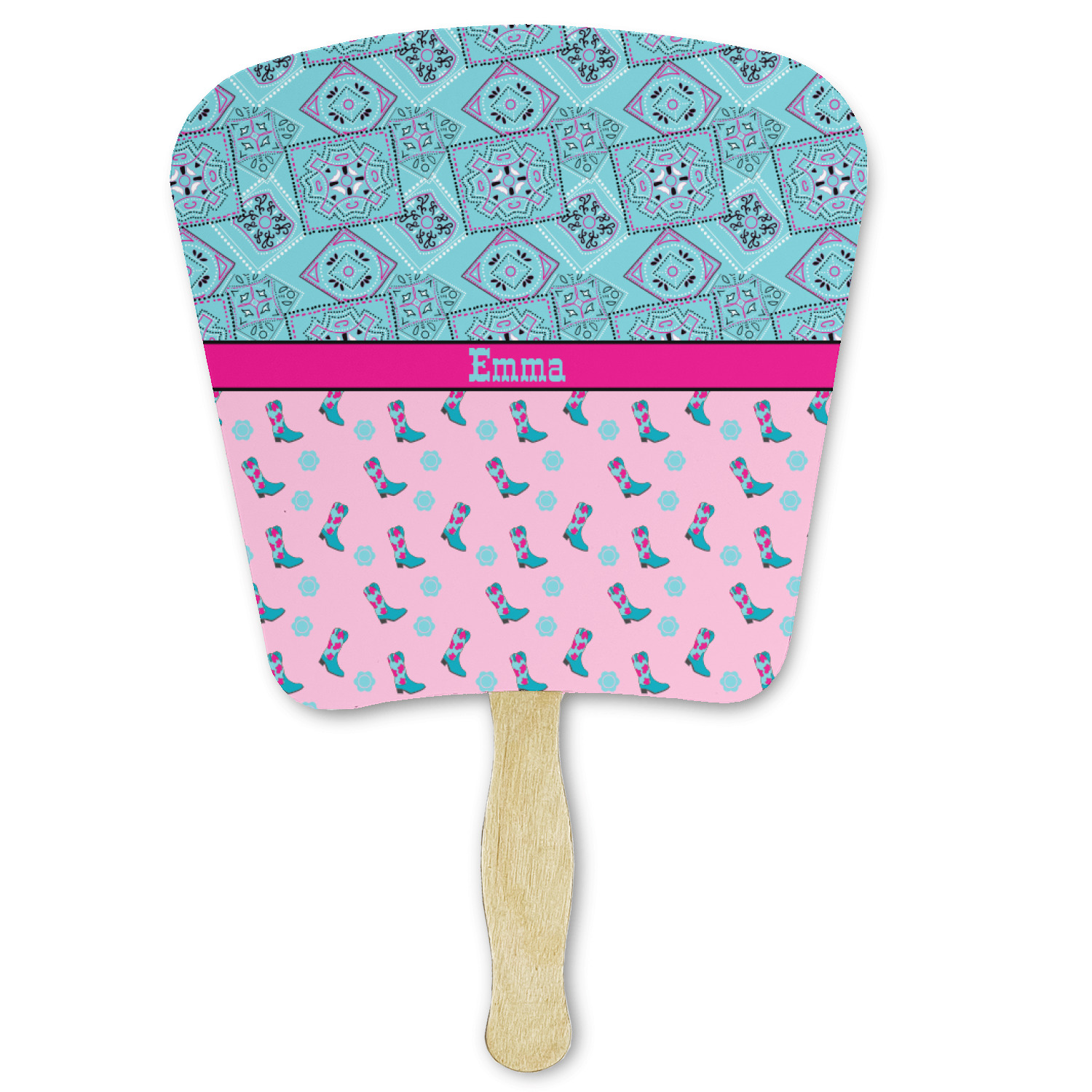 This design has a wild west theme and features a turquoise and pink bandana print on the top half, a pink stripe across the middle, and cowgirl boots and flowers on the bottom. The coordinating design is hot pink, has a turquoise stripe and scalloped circle in the middle, and horseshoes in the background print.