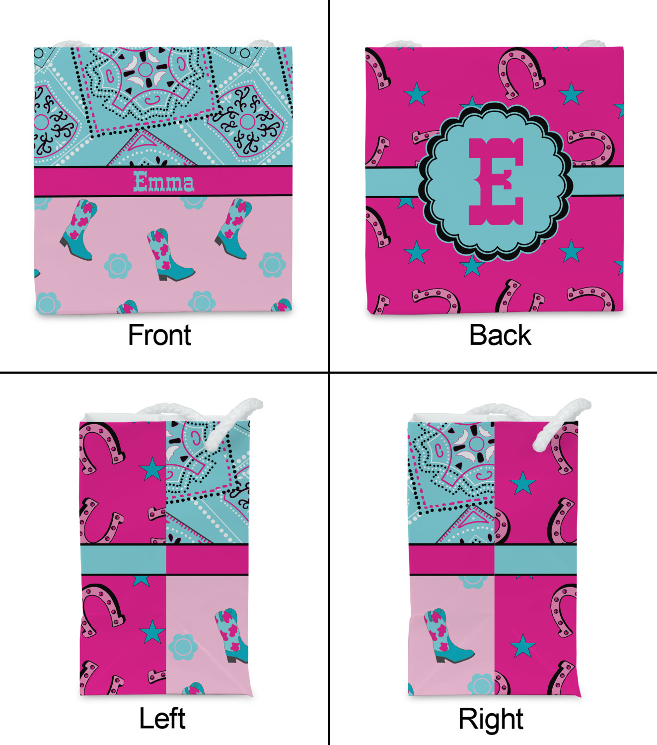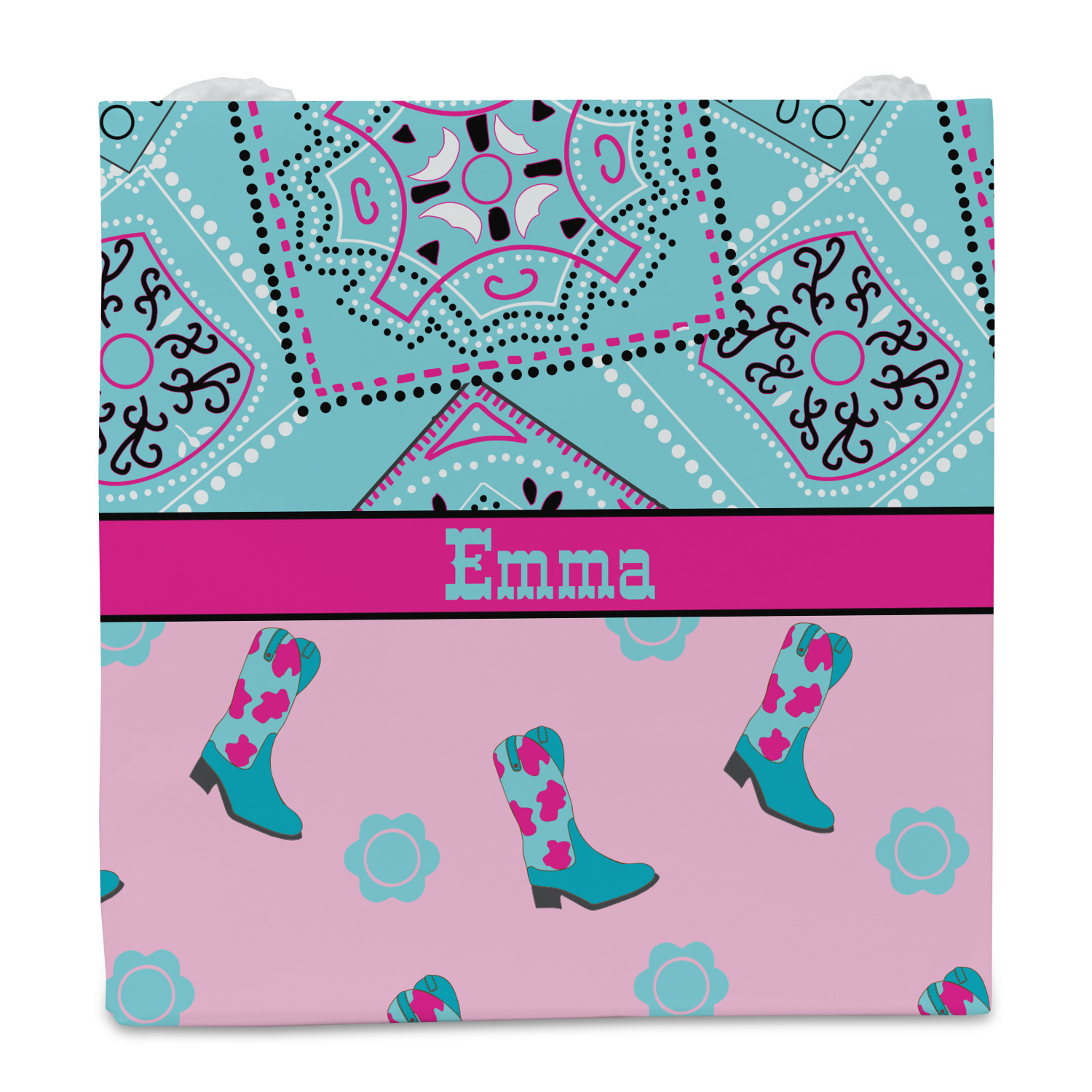 This design has a wild west theme and features a turquoise and pink bandana print on the top half, a pink stripe across the middle, and cowgirl boots and flowers on the bottom. The coordinating design is hot pink, has a turquoise stripe and scalloped circle in the middle, and horseshoes in the background print.