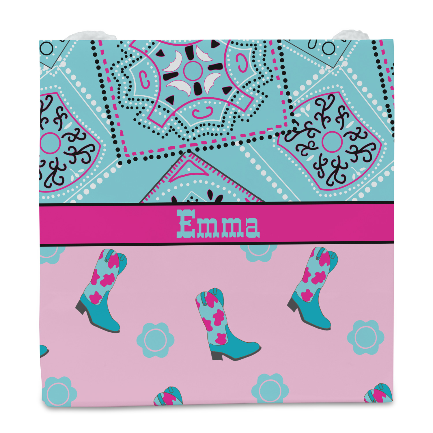 This design has a wild west theme and features a turquoise and pink bandana print on the top half, a pink stripe across the middle, and cowgirl boots and flowers on the bottom. The coordinating design is hot pink, has a turquoise stripe and scalloped circle in the middle, and horseshoes in the background print.