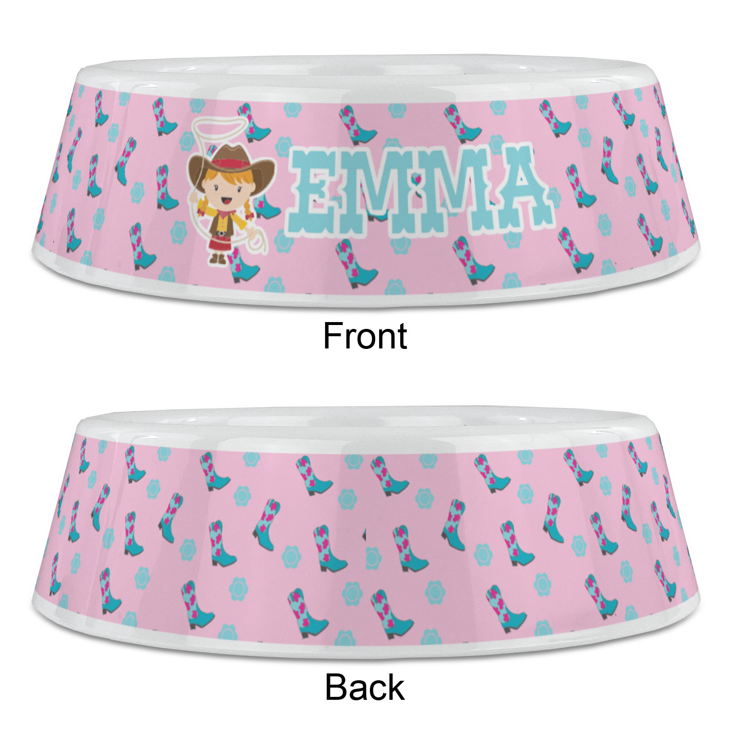 This design has a wild west theme and features a turquoise and pink bandana print on the top half, a pink stripe across the middle, and cowgirl boots and flowers on the bottom. The coordinating design is hot pink, has a turquoise stripe and scalloped circle in the middle, and horseshoes in the background print.