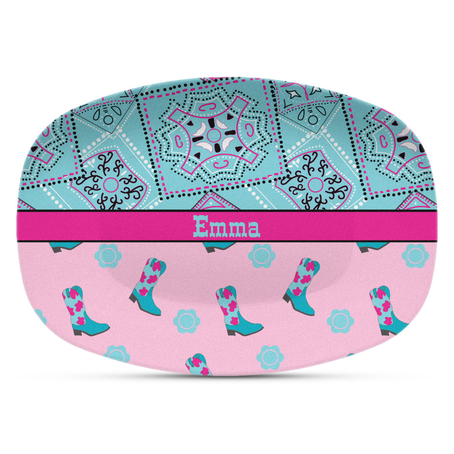 This design has a wild west theme and features a turquoise and pink bandana print on the top half, a pink stripe across the middle, and cowgirl boots and flowers on the bottom. The coordinating design is hot pink, has a turquoise stripe and scalloped circle in the middle, and horseshoes in the background print.