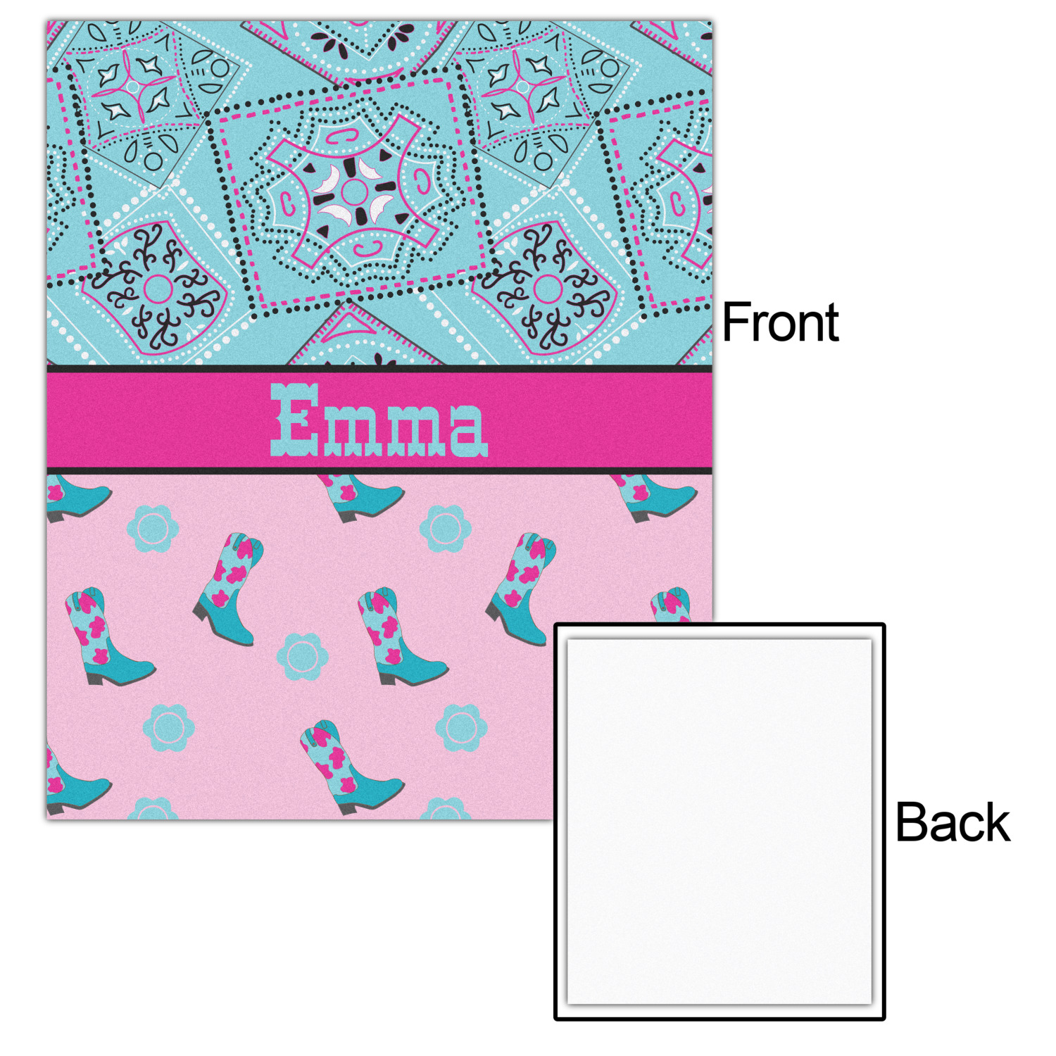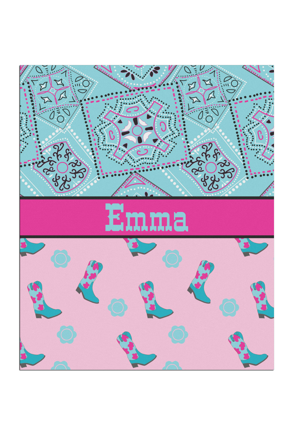 This design has a wild west theme and features a turquoise and pink bandana print on the top half, a pink stripe across the middle, and cowgirl boots and flowers on the bottom. The coordinating design is hot pink, has a turquoise stripe and scalloped circle in the middle, and horseshoes in the background print.