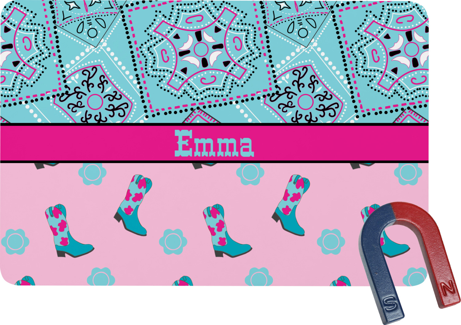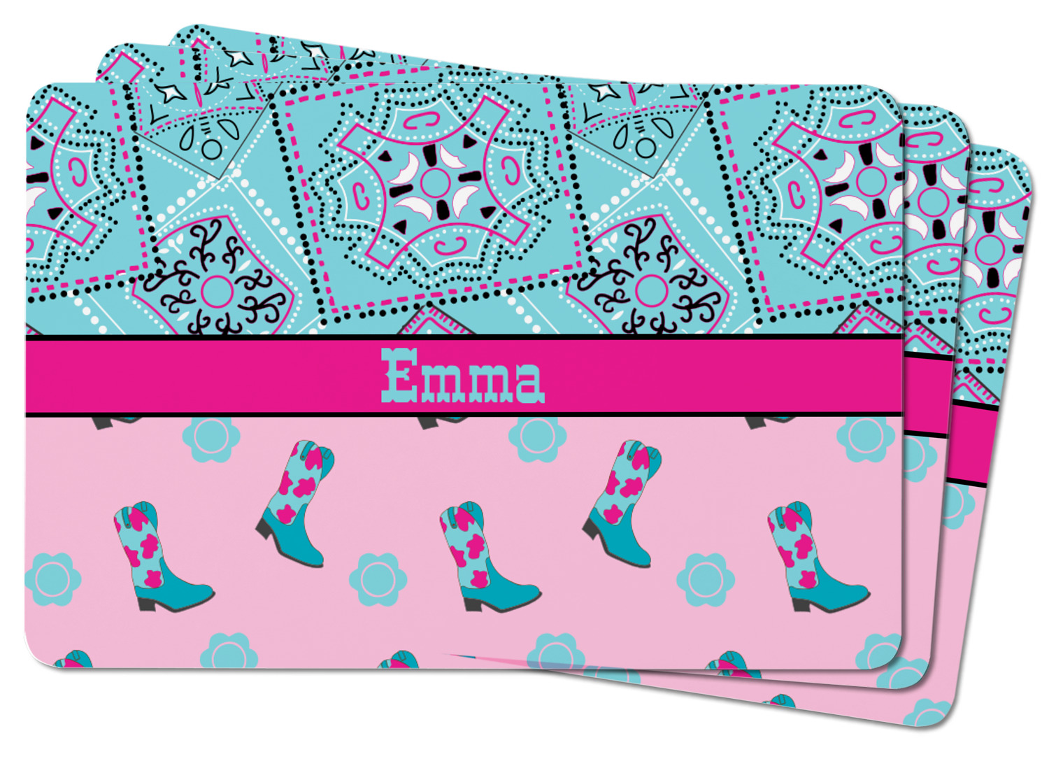 This design has a wild west theme and features a turquoise and pink bandana print on the top half, a pink stripe across the middle, and cowgirl boots and flowers on the bottom. The coordinating design is hot pink, has a turquoise stripe and scalloped circle in the middle, and horseshoes in the background print.