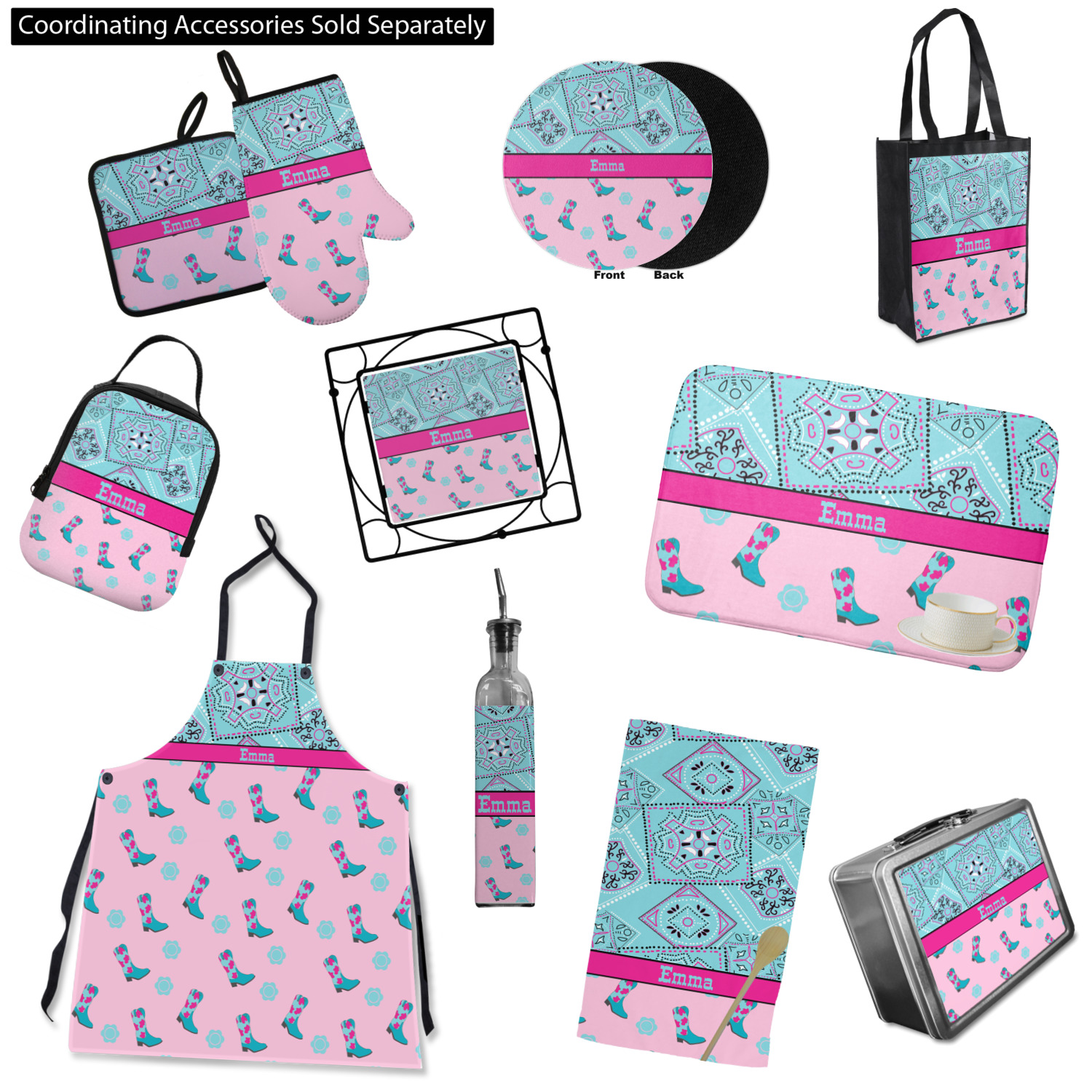 This design has a wild west theme and features a turquoise and pink bandana print on the top half, a pink stripe across the middle, and cowgirl boots and flowers on the bottom. The coordinating design is hot pink, has a turquoise stripe and scalloped circle in the middle, and horseshoes in the background print.