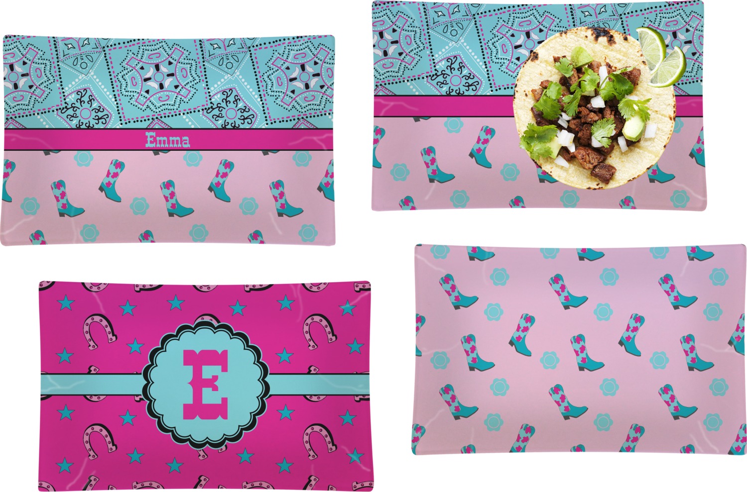 This design has a wild west theme and features a turquoise and pink bandana print on the top half, a pink stripe across the middle, and cowgirl boots and flowers on the bottom. The coordinating design is hot pink, has a turquoise stripe and scalloped circle in the middle, and horseshoes in the background print.