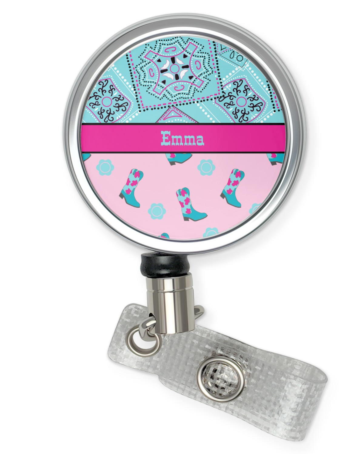 This design has a wild west theme and features a turquoise and pink bandana print on the top half, a pink stripe across the middle, and cowgirl boots and flowers on the bottom. The coordinating design is hot pink, has a turquoise stripe and scalloped circle in the middle, and horseshoes in the background print.