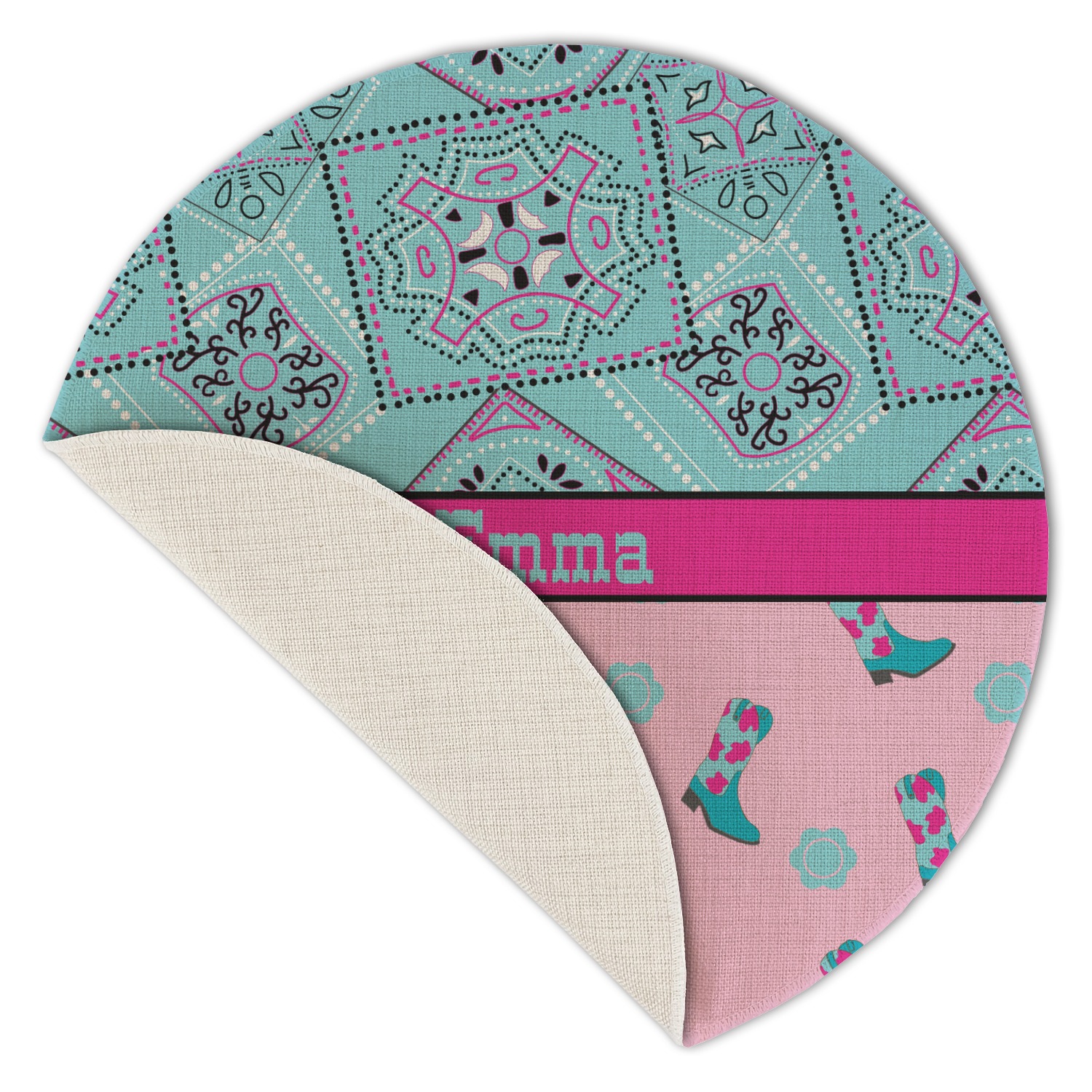 This design has a wild west theme and features a turquoise and pink bandana print on the top half, a pink stripe across the middle, and cowgirl boots and flowers on the bottom. The coordinating design is hot pink, has a turquoise stripe and scalloped circle in the middle, and horseshoes in the background print.