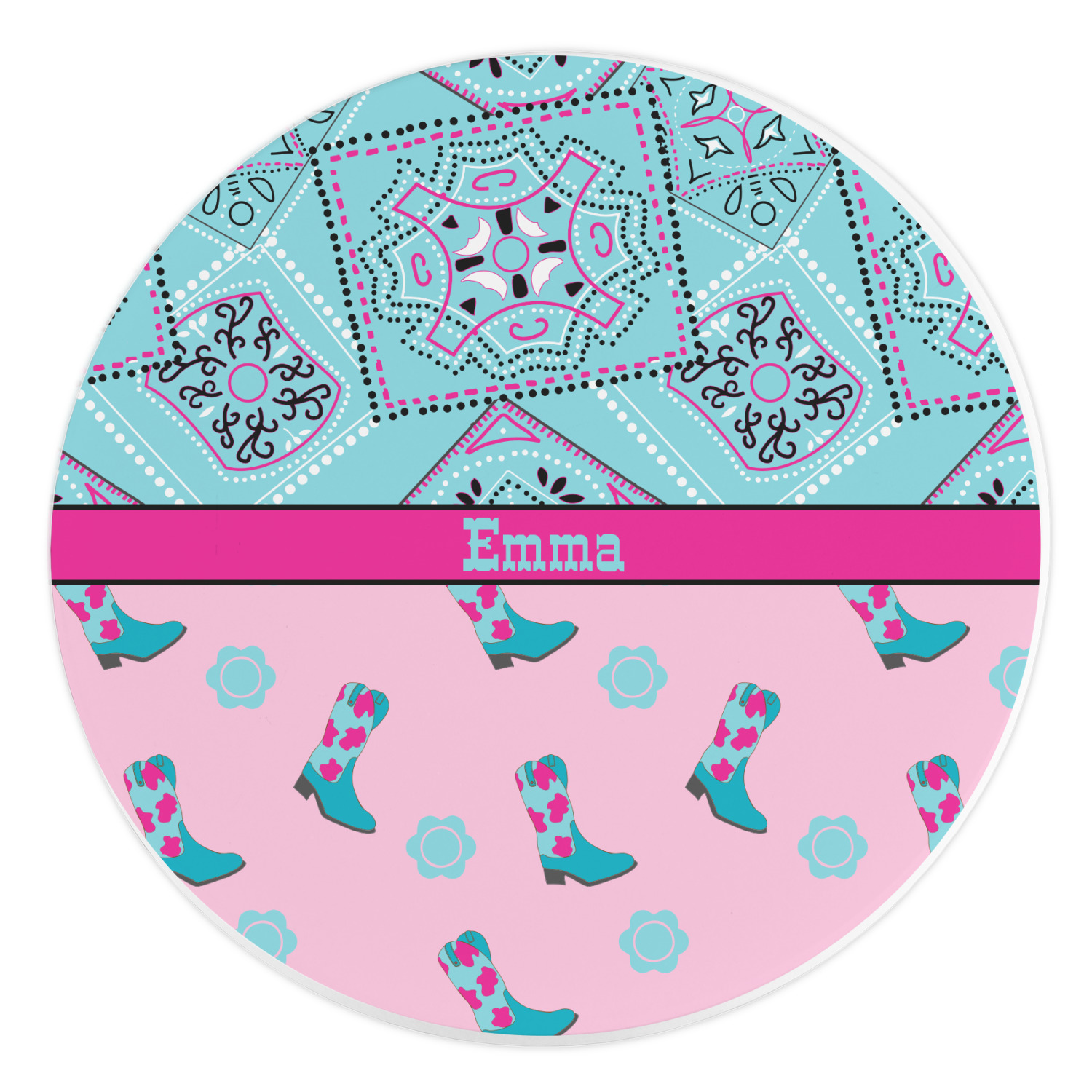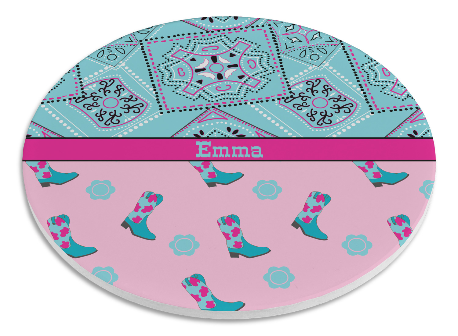 This design has a wild west theme and features a turquoise and pink bandana print on the top half, a pink stripe across the middle, and cowgirl boots and flowers on the bottom. The coordinating design is hot pink, has a turquoise stripe and scalloped circle in the middle, and horseshoes in the background print.