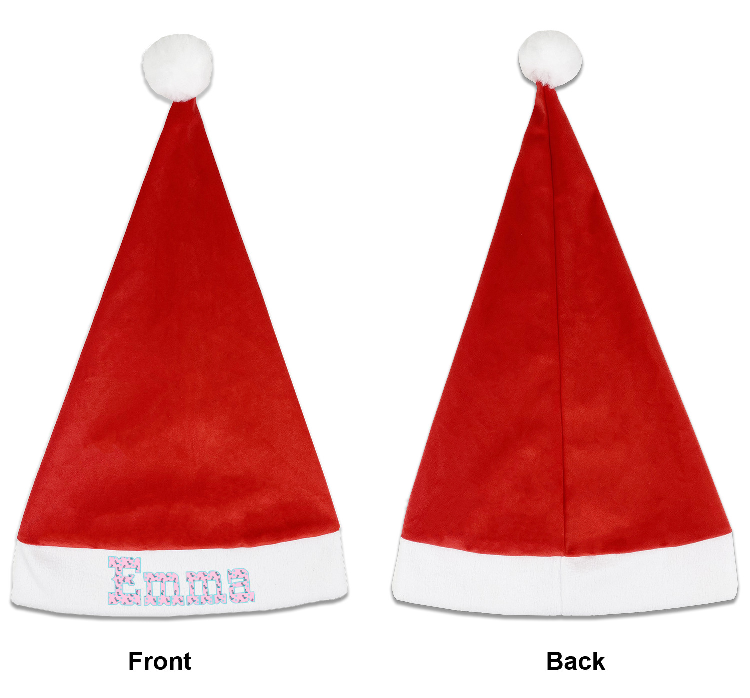 Our Santa hats are a soft, velvety polyester material. These customizable Santa hats are a classic red with white brimming and pom pom ball hanging off the hat tail just like Santa Claus! Each personalized Santa hat is approximately 17.5 L x 11.8 W. We offer two different styles to print your designs on the white brim - front or front & back.