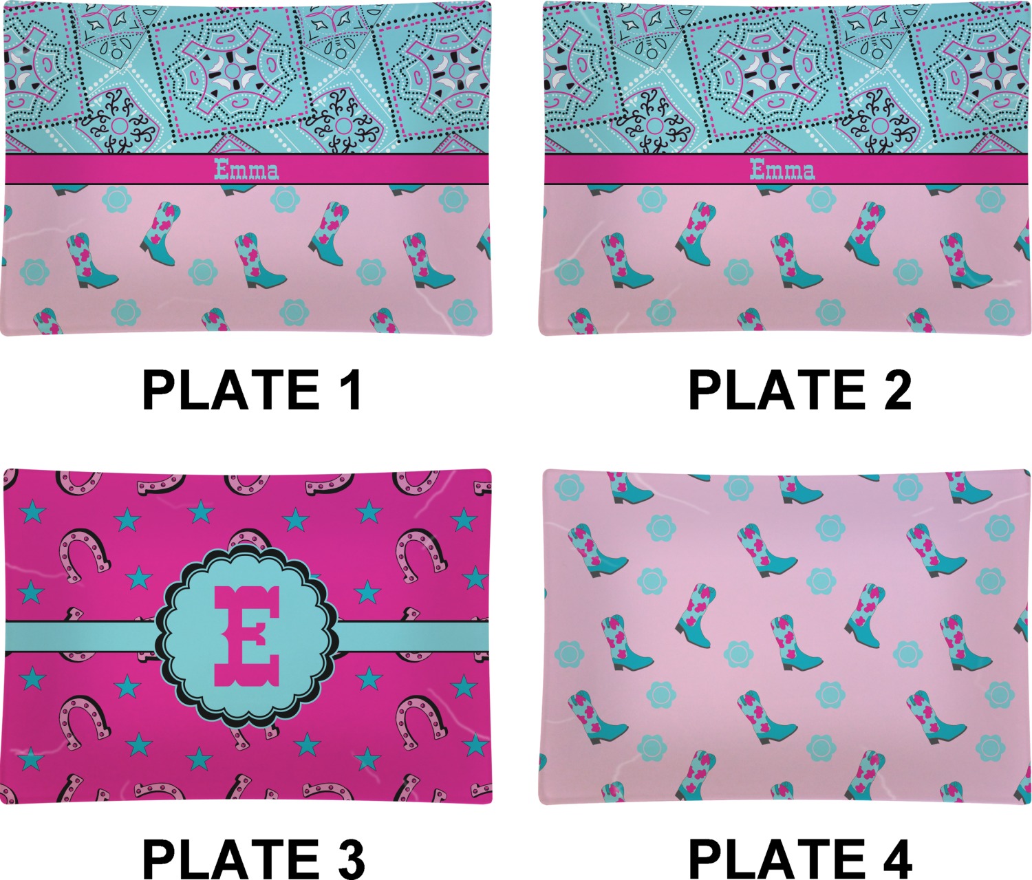 This design has a wild west theme and features a turquoise and pink bandana print on the top half, a pink stripe across the middle, and cowgirl boots and flowers on the bottom. The coordinating design is hot pink, has a turquoise stripe and scalloped circle in the middle, and horseshoes in the background print.