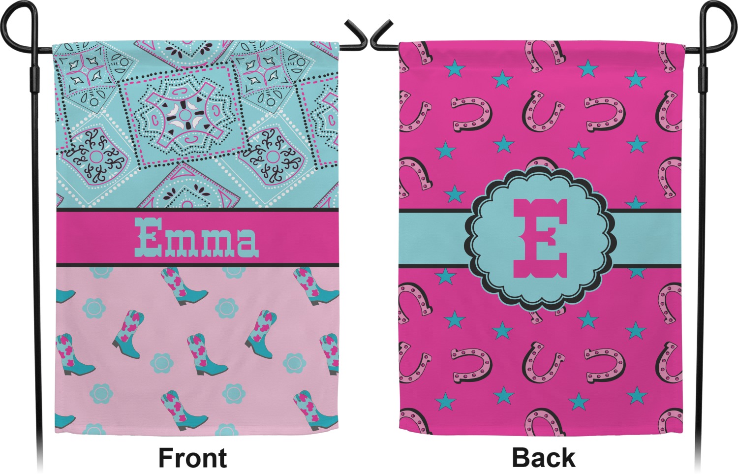 These custom garden flags are made of a durable, double-ply, polyester weave, allowing them to withstand the elements year round. The small flags measure at approximately 12 by 18 inches. The large flags measure out to 28 by 37 inches. You can order these decorative flags with your customization printed on the front only, or the front and back.