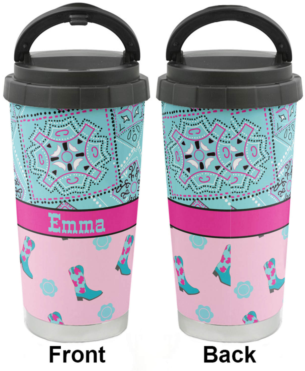 This design has a wild west theme and features a turquoise and pink bandana print on the top half, a pink stripe across the middle, and cowgirl boots and flowers on the bottom. The coordinating design is hot pink, has a turquoise stripe and scalloped circle in the middle, and horseshoes in the background print.
