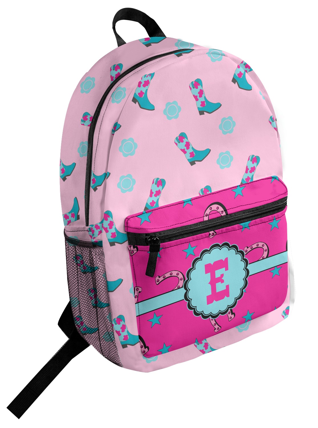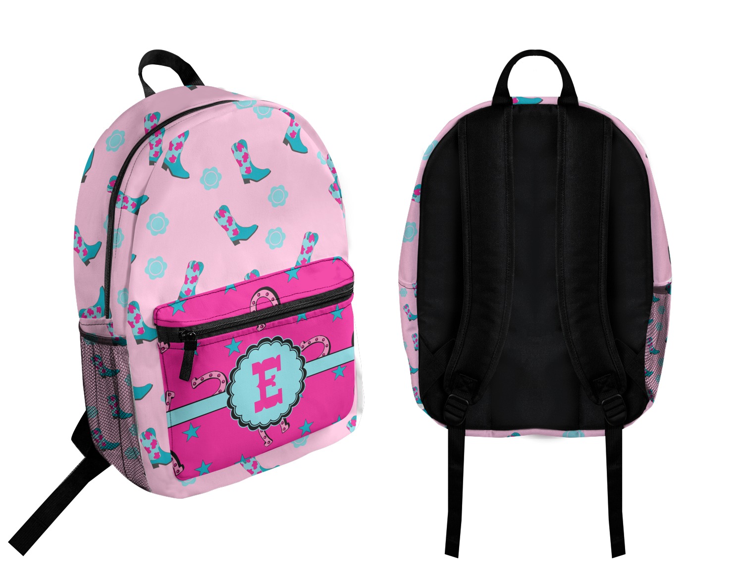 This design has a wild west theme and features a turquoise and pink bandana print on the top half, a pink stripe across the middle, and cowgirl boots and flowers on the bottom. The coordinating design is hot pink, has a turquoise stripe and scalloped circle in the middle, and horseshoes in the background print.