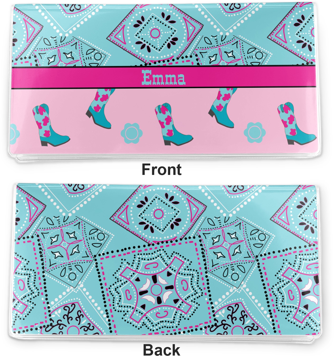 This design has a wild west theme and features a turquoise and pink bandana print on the top half, a pink stripe across the middle, and cowgirl boots and flowers on the bottom. The coordinating design is hot pink, has a turquoise stripe and scalloped circle in the middle, and horseshoes in the background print.