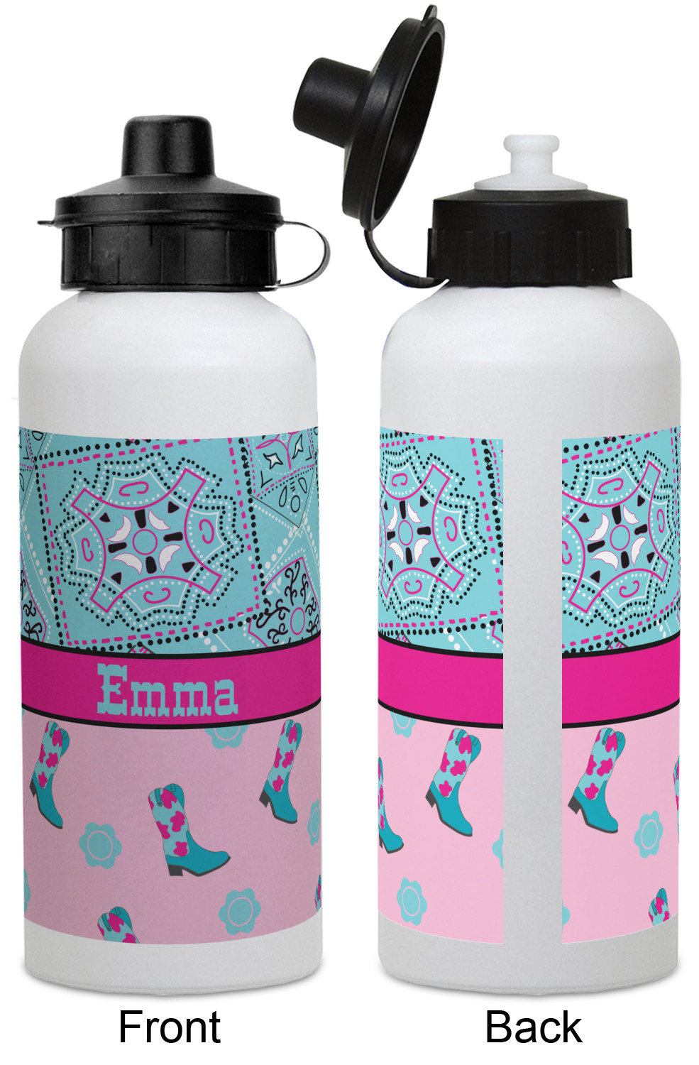 This design has a wild west theme and features a turquoise and pink bandana print on the top half, a pink stripe across the middle, and cowgirl boots and flowers on the bottom. The coordinating design is hot pink, has a turquoise stripe and scalloped circle in the middle, and horseshoes in the background print.
