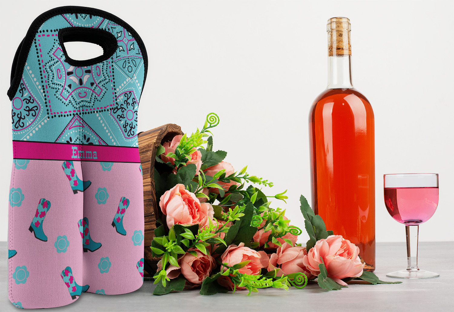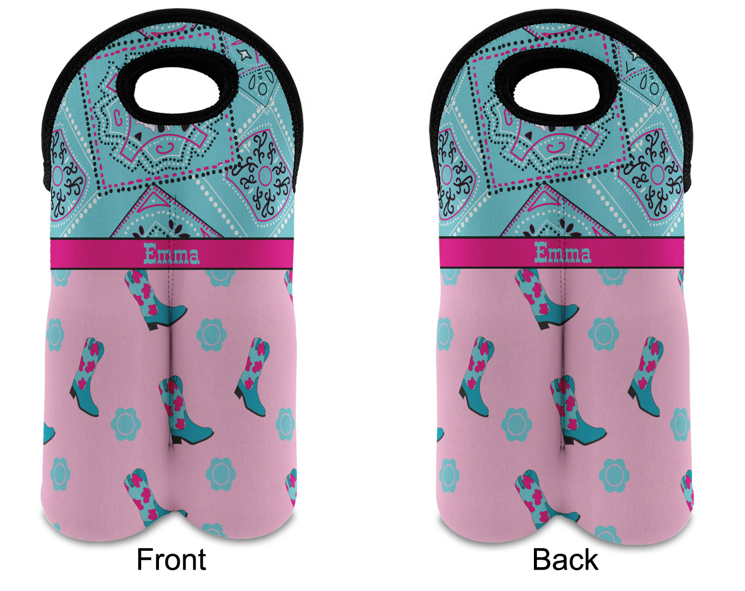 These tote bags are insulated to keep the bottles cold and have a stitched separation down the middle and double handles to keep the two bottles safe and secure during travels.