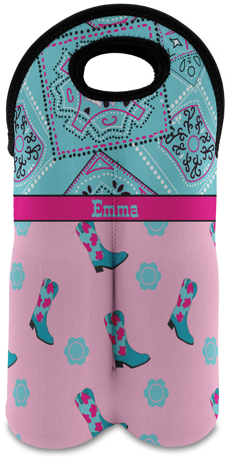 This design has a wild west theme and features a turquoise and pink bandana print on the top half, a pink stripe across the middle, and cowgirl boots and flowers on the bottom. The coordinating design is hot pink, has a turquoise stripe and scalloped circle in the middle, and horseshoes in the background print.
