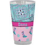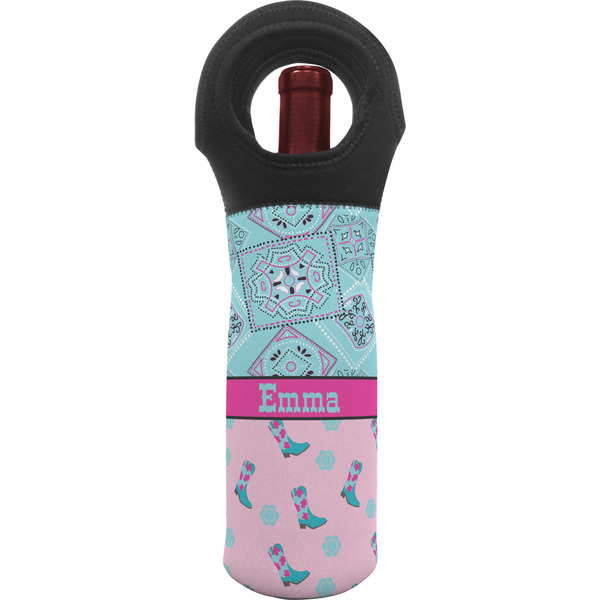 This design has a wild west theme and features a turquoise and pink bandana print on the top half, a pink stripe across the middle, and cowgirl boots and flowers on the bottom. The coordinating design is hot pink, has a turquoise stripe and scalloped circle in the middle, and horseshoes in the background print.