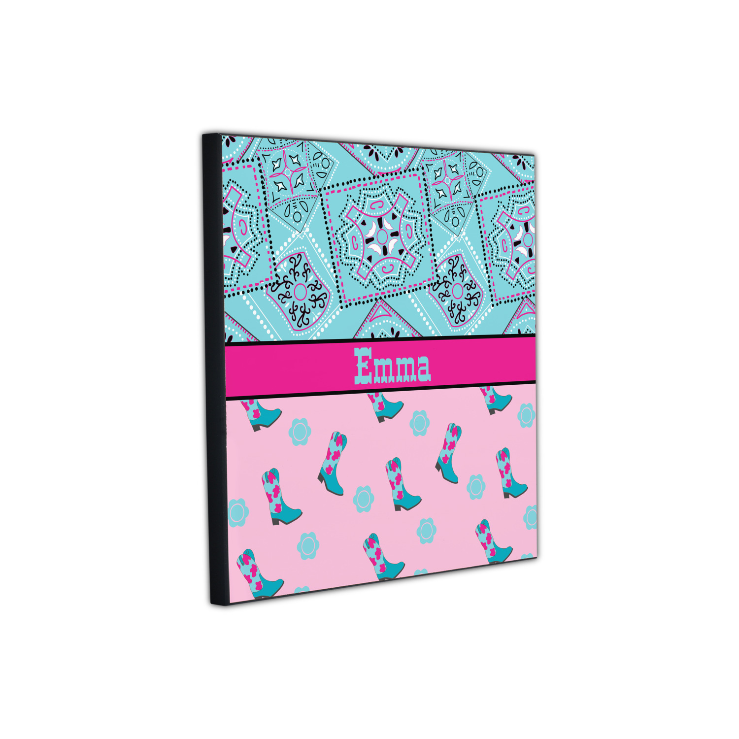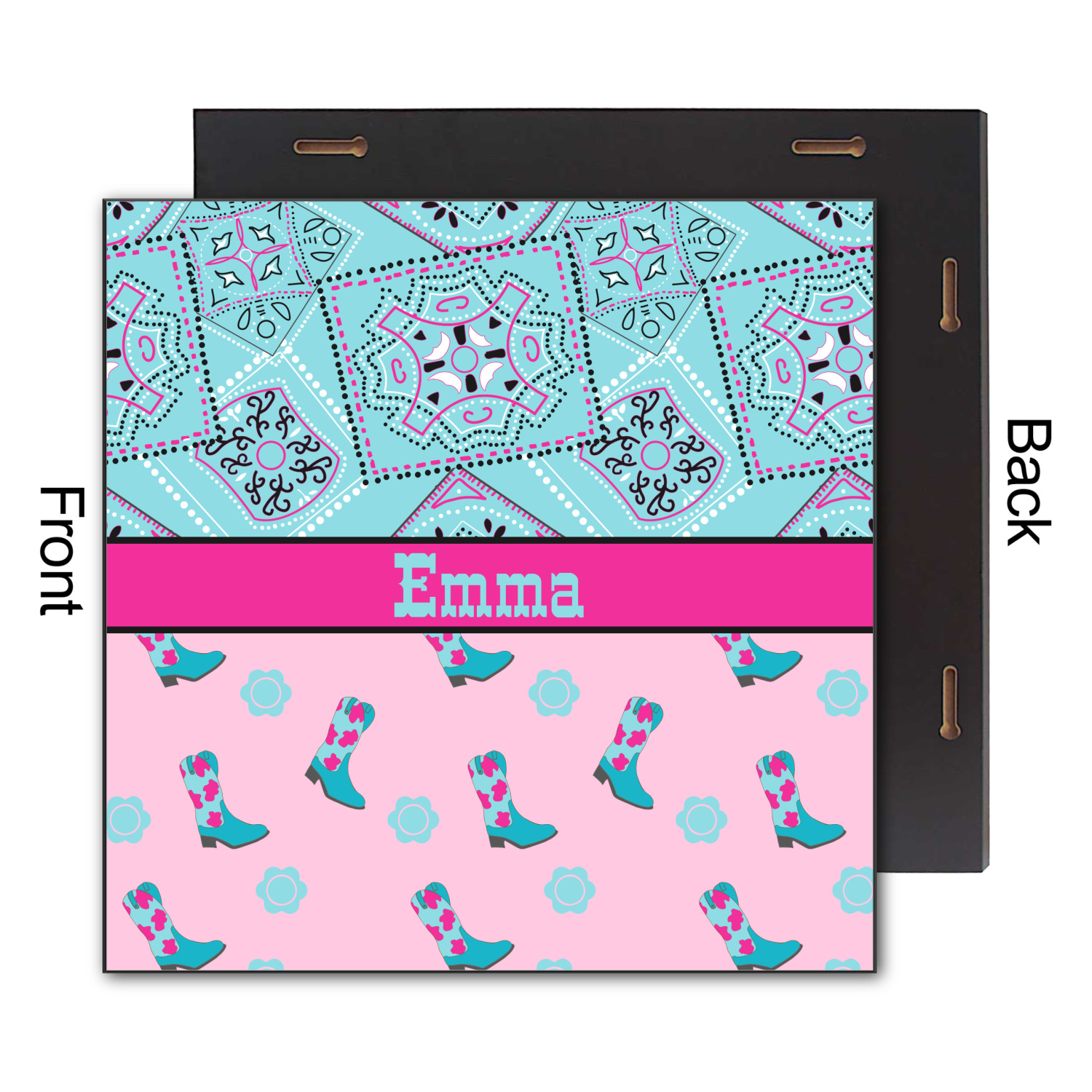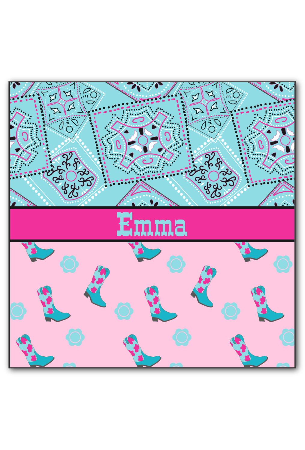 This design has a wild west theme and features a turquoise and pink bandana print on the top half, a pink stripe across the middle, and cowgirl boots and flowers on the bottom. The coordinating design is hot pink, has a turquoise stripe and scalloped circle in the middle, and horseshoes in the background print.