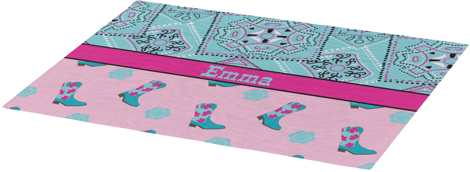 This design has a wild west theme and features a turquoise and pink bandana print on the top half, a pink stripe across the middle, and cowgirl boots and flowers on the bottom. The coordinating design is hot pink, has a turquoise stripe and scalloped circle in the middle, and horseshoes in the background print.