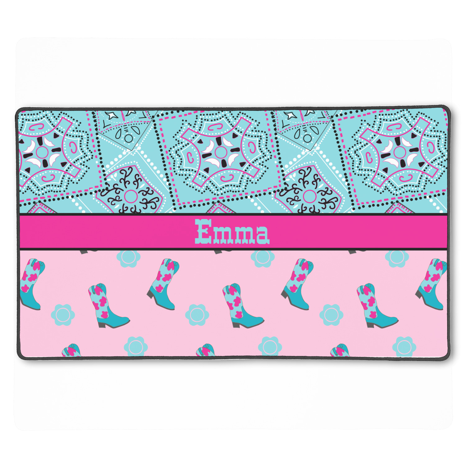 This design has a wild west theme and features a turquoise and pink bandana print on the top half, a pink stripe across the middle, and cowgirl boots and flowers on the bottom. The coordinating design is hot pink, has a turquoise stripe and scalloped circle in the middle, and horseshoes in the background print.