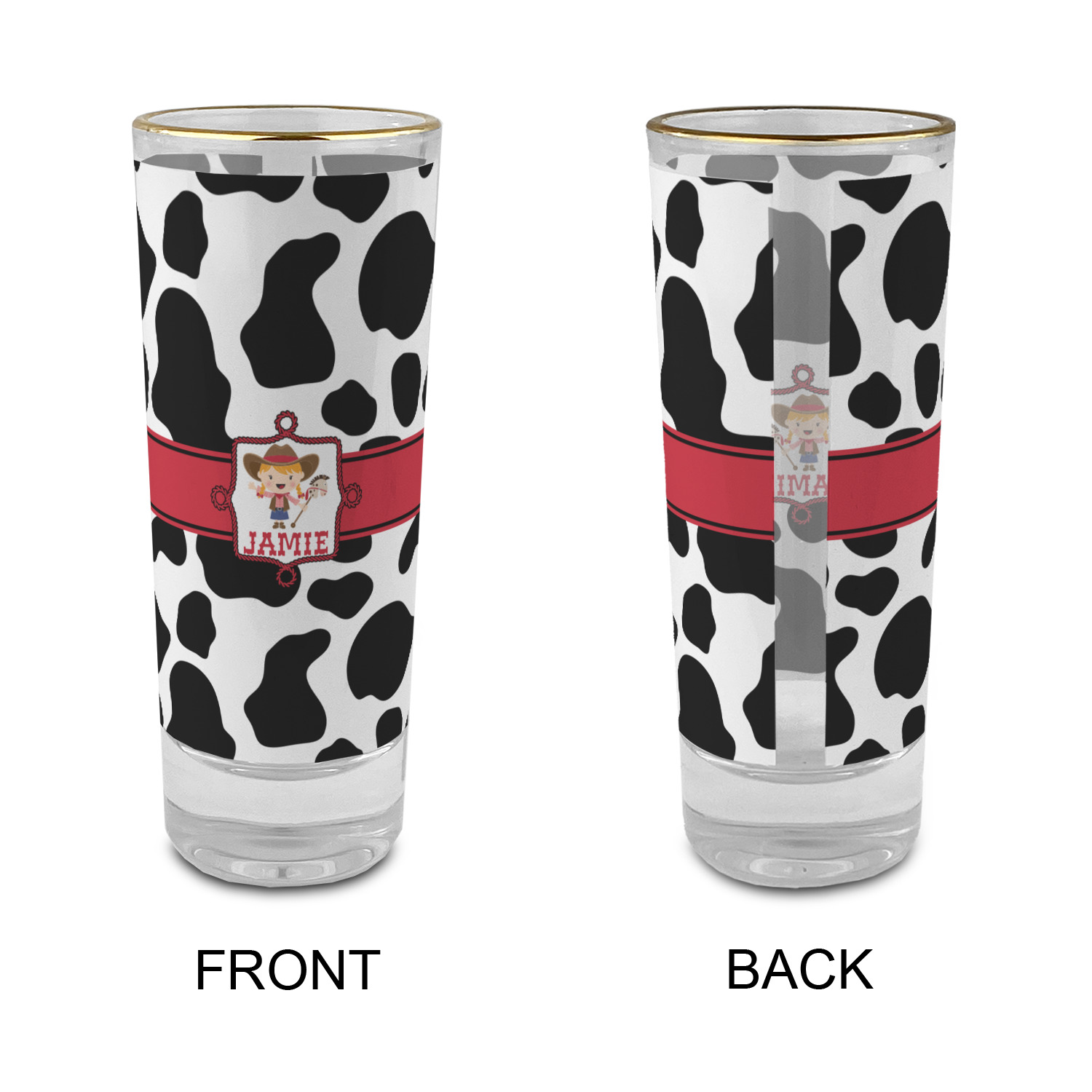 These glass shooter glasses are printed in full color with the design of your choice. These are a tall shooter 2 oz size and stand 4" tall. The print is a full wrap design to boldly display your personalization.