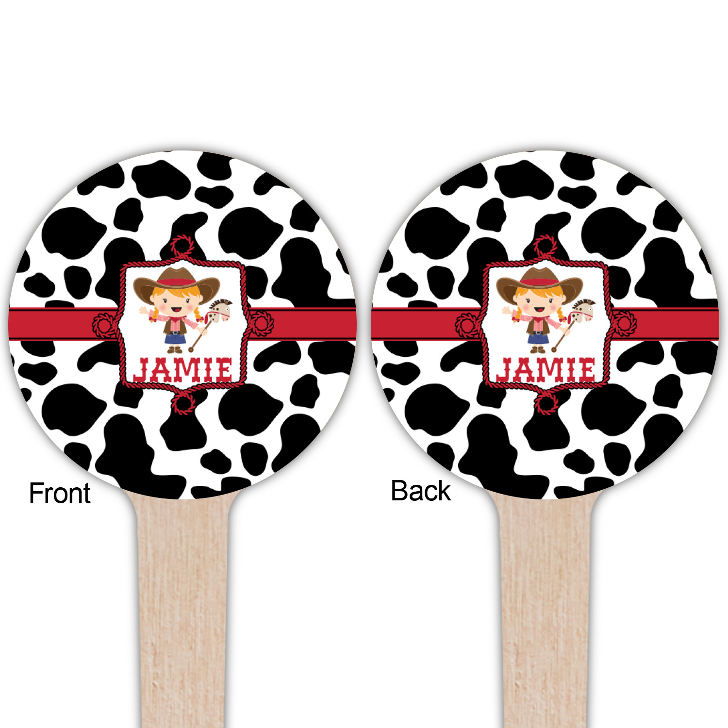This western themed design is perfect a cowboy or cowgirl. The background is cow print, with a red ribbon in the center. The label is made of rope and you can customize it by choosing a cowgirl or a cowboy.