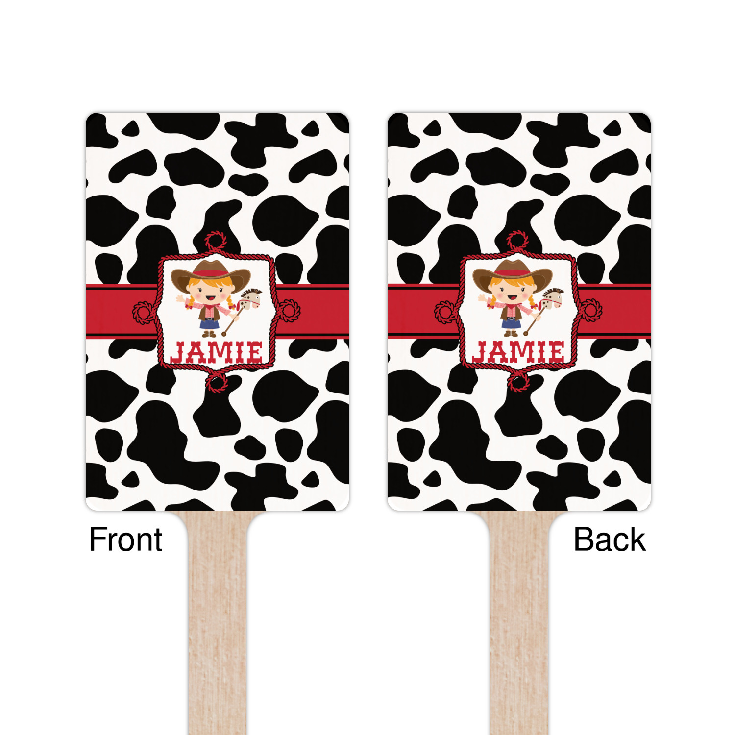 This western themed design is perfect a cowboy or cowgirl. The background is cow print, with a red ribbon in the center. The label is made of rope and you can customize it by choosing a cowgirl or a cowboy.
