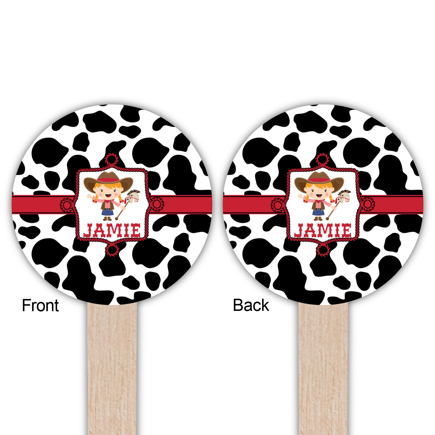 This western themed design is perfect a cowboy or cowgirl. The background is cow print, with a red ribbon in the center. The label is made of rope and you can customize it by choosing a cowgirl or a cowboy.