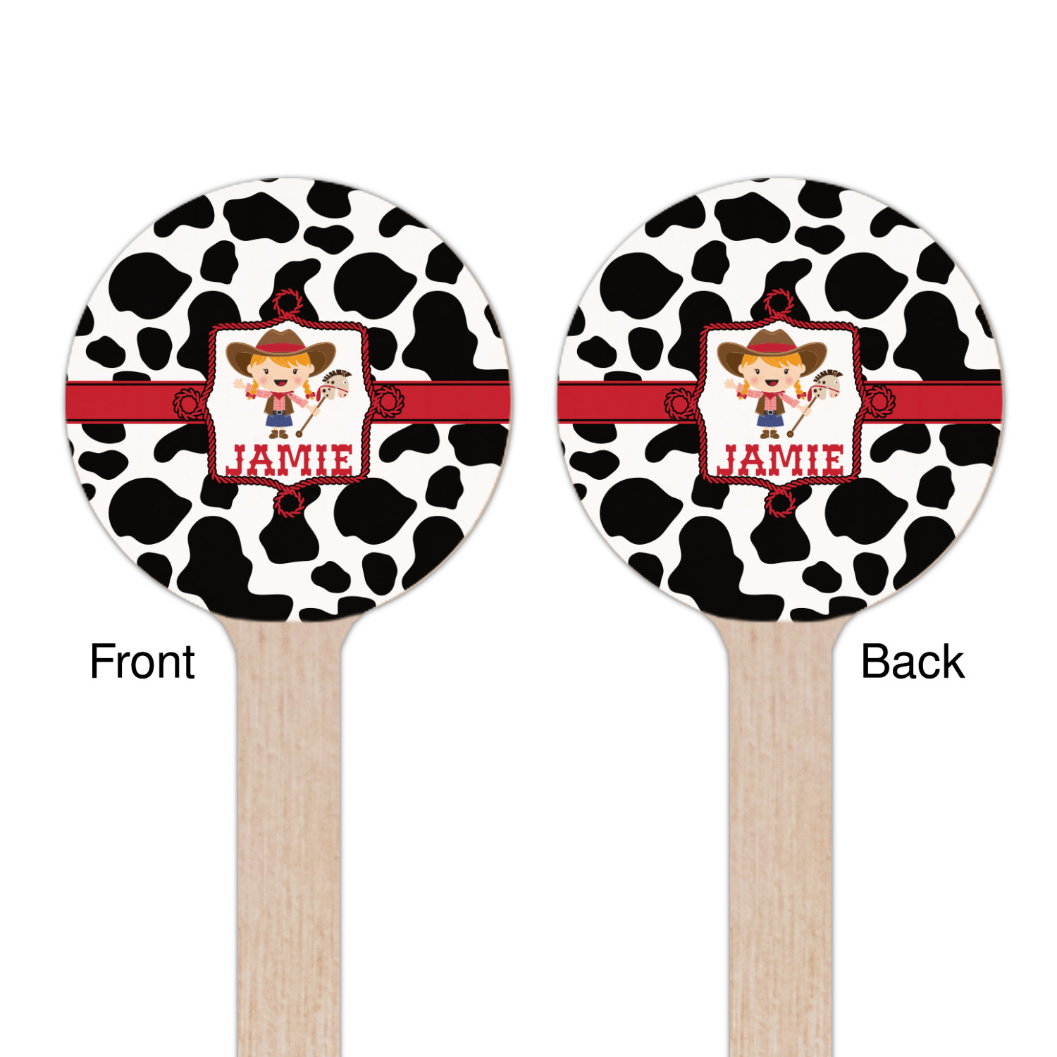 This western themed design is perfect a cowboy or cowgirl. The background is cow print, with a red ribbon in the center. The label is made of rope and you can customize it by choosing a cowgirl or a cowboy.