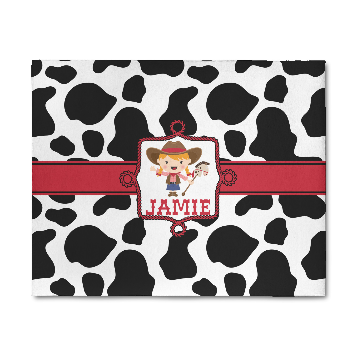 This western themed design is perfect a cowboy or cowgirl. The background is cow print, with a red ribbon in the center. The label is made of rope and you can customize it by choosing a cowgirl or a cowboy.