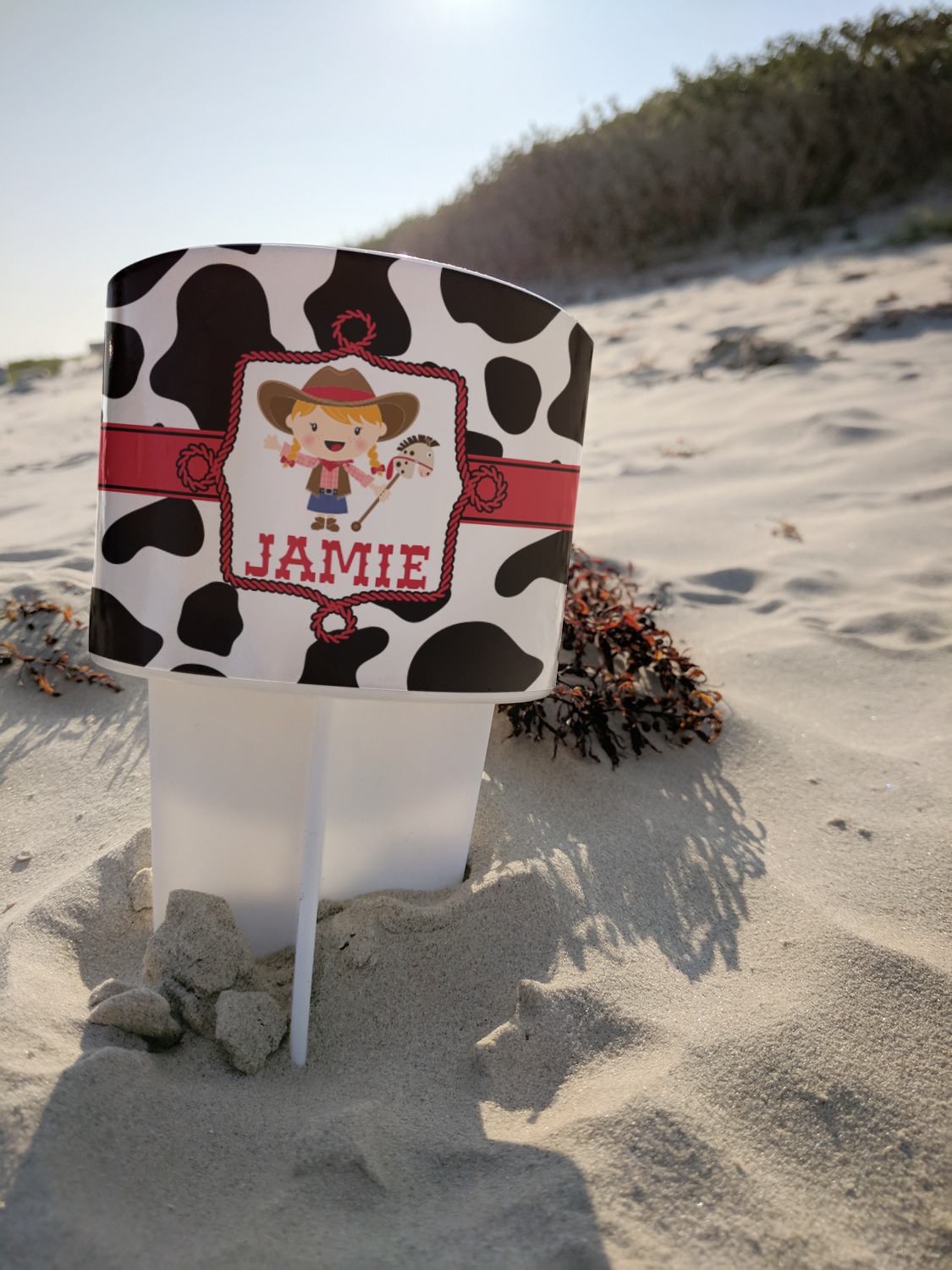 This cup holder has a large stake at its bottom that anchors it to the sand or ground below, while the cup holder rests above the stake. The entire drink holder is made of durable plastic and displays your customization around the cup holder portion. We sell these personalized beach spikers in two different colors: black and white.