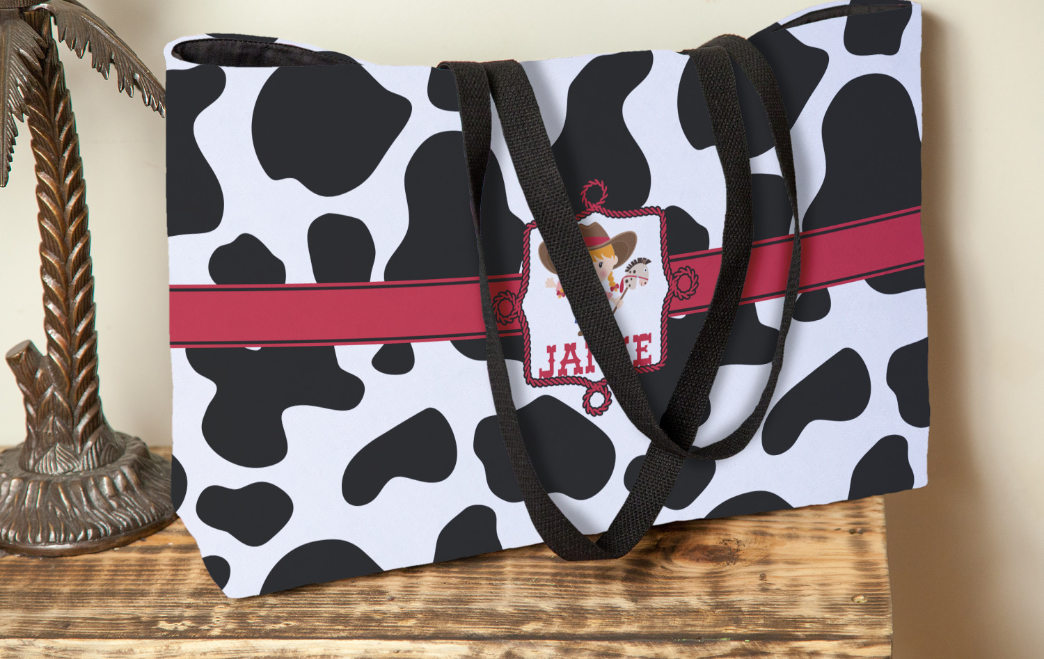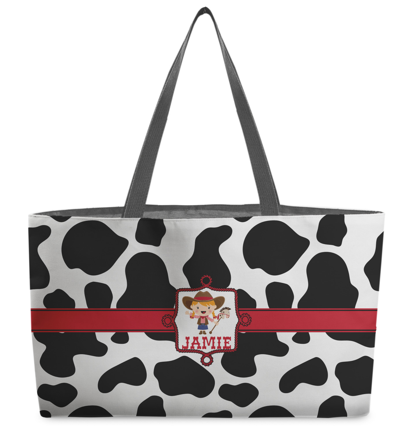This western themed design is perfect a cowboy or cowgirl. The background is cow print, with a red ribbon in the center. The label is made of rope and you can customize it by choosing a cowgirl or a cowboy.