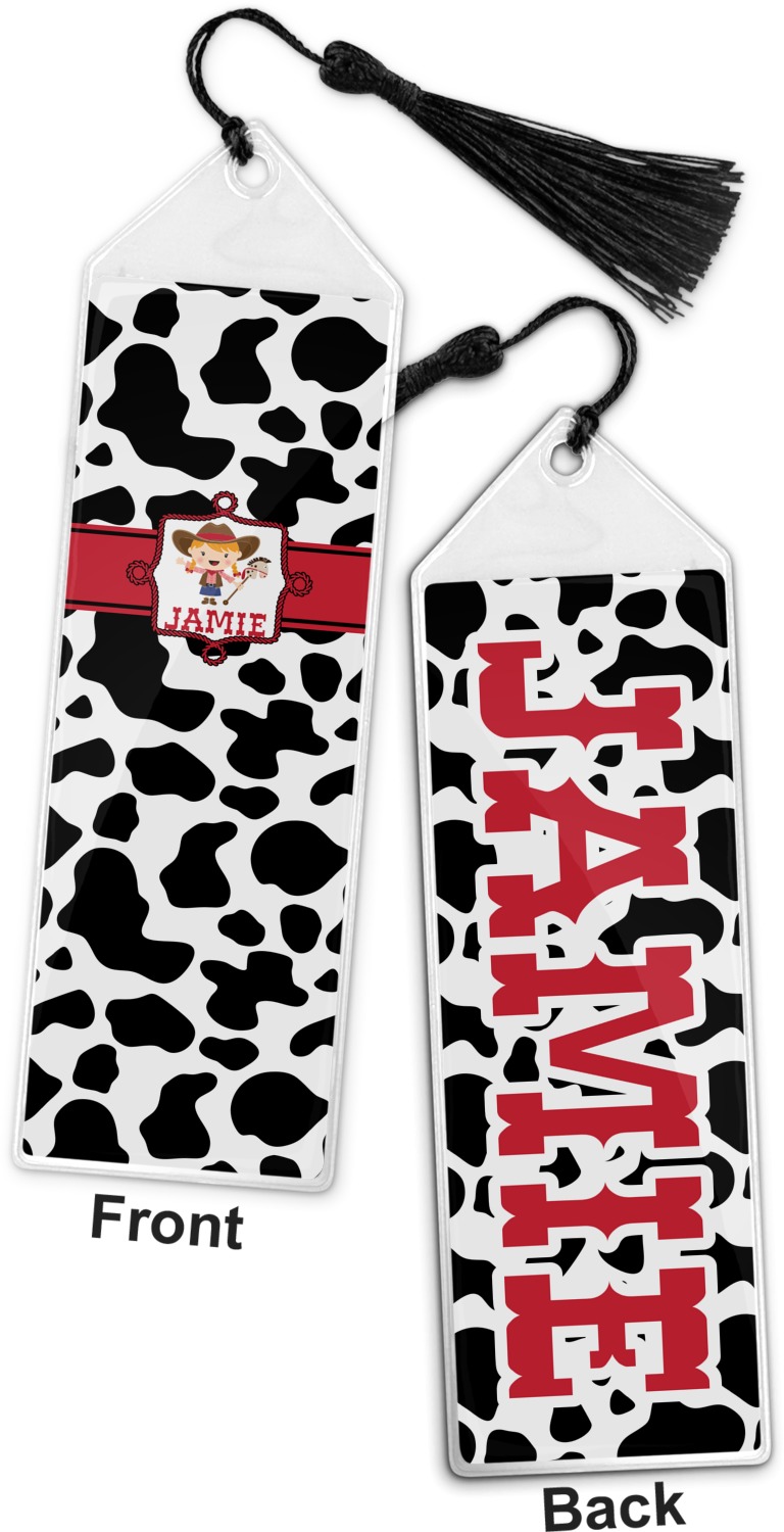 Your personalized bookmark is made of a sturdy, clear vinyl, and is approximately 7.5" x 2.25". We display your personalization on vinyl inserts that are placed on both sides. Accompanying each book marker is a black, fringe tassel that attaches to the reinforced, triangular header.